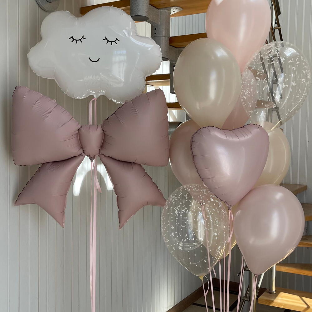 Included in the set: 1 figure: cloud 1 figure: bow 1 bouquet of 10 balloons ( 1 heart 45cm , 2 balloons 30cm with styrofoam, 7 balloons 30cm pastel) 3 weights 2 bags for transportation Total number of balloons: 12 Filling: All balloons are helium-filled длина, мм: 2000 ширина, мм: 2000 высота, мм: 2000