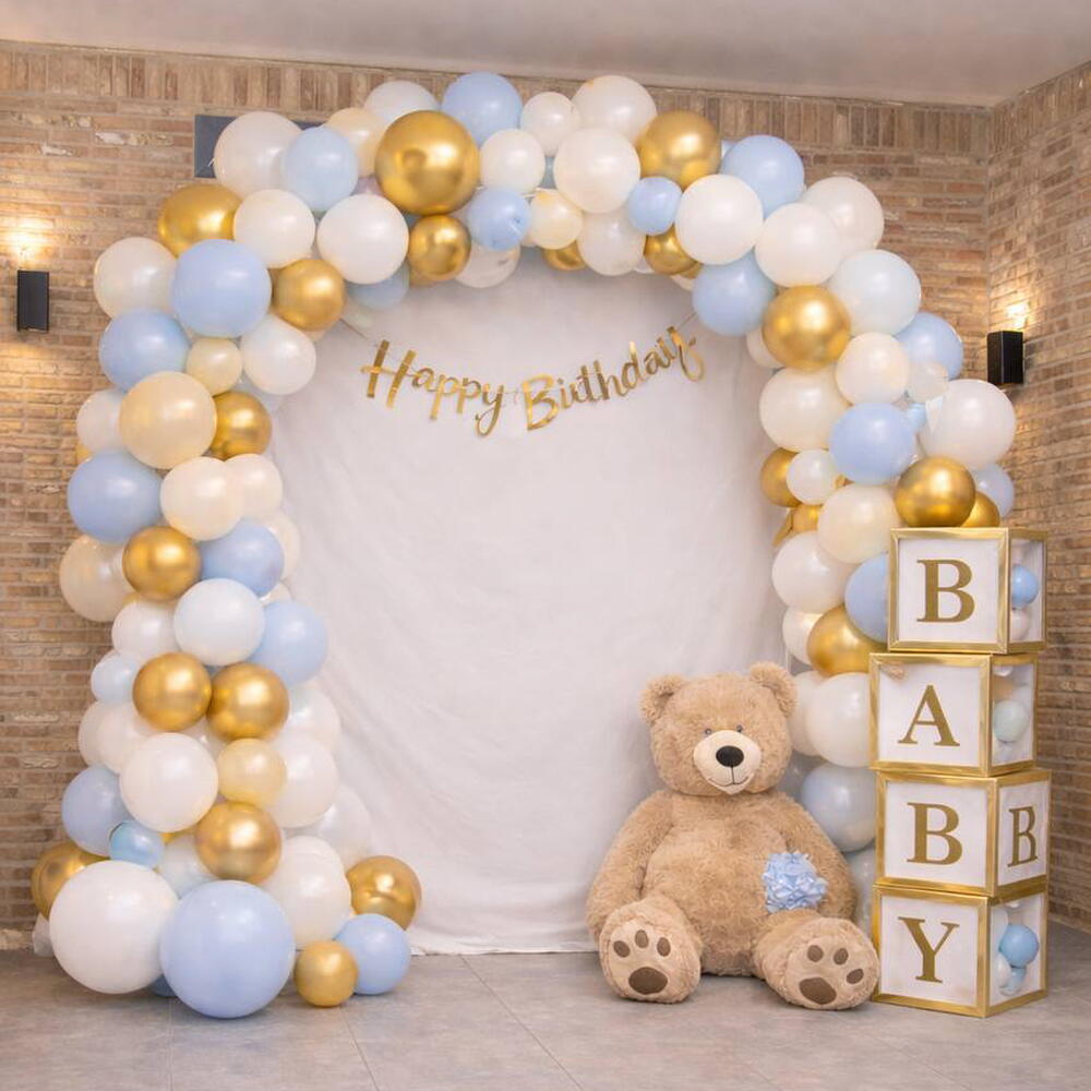 What is this decoration made of? Balloon arch: Made of latex balloons in various sizes Frame: A hidden arch-shaped structure that supports the balloons. Sign: Gold, mirrored "Happy Birthday" sign Decorative elements at the bottom: A large plush teddy bear (available for rent). Transparent boxes labeled "BABY" filled with small balloons.