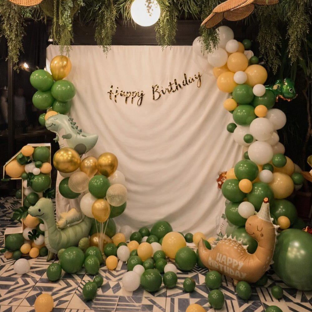 What is this backdrop made of Asymmetrical organic garland: Made of balloons in various sizes. Foil dinosaur balloons: The garland incorporates balloons shaped like cute dinosaurs. Background and lettering: A white, elegantly draped fabric forms the base, on which a mirrored, gold "Happy Birthday" sign is hung. Large number "1" filled with smaller balloons. There is the option to choose the number Balloons scattered freely on the floor, which visually enlarges the decoration.