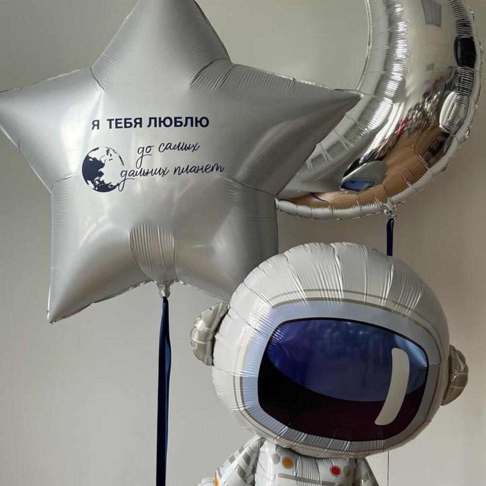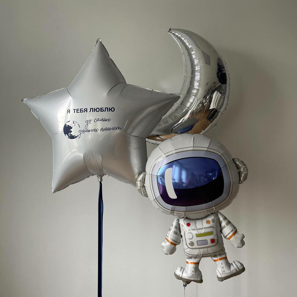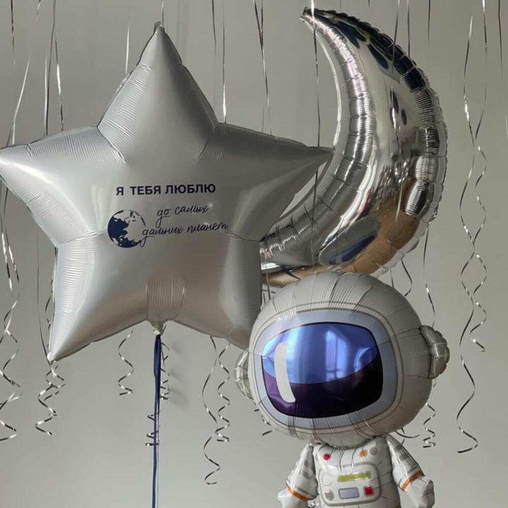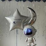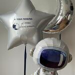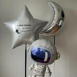 Set composition: - Foil figure “Cosmonaut”; - Foil figure “Star” with individual inscription; - Foil figure “Moon” - 12 latex balloons of standard size “under the ceiling”. *The inscription on the big balloon can be any (not more than 5 words). Specify it in the comments to the order. **Colors of balloon composition can be chosen. Write your wishes on colors when placing an order.