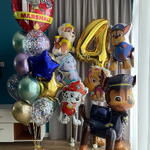 Included in the set: Number 1 bouquet of 16 balloons ( 3 stars 45cm , 9 balloons 30cm chrome, 3 balloons 30cm with confetti, 1 figure: Paw Patrol ) 5 figures: Paw Patrol 1 standing figure: Paw Patrol 6 weights 5 bags for transportation Total number of balloons: 23 Filling: All balloons with helium длина, мм: 2000 ширина, мм: 2000 высота, мм: 2000