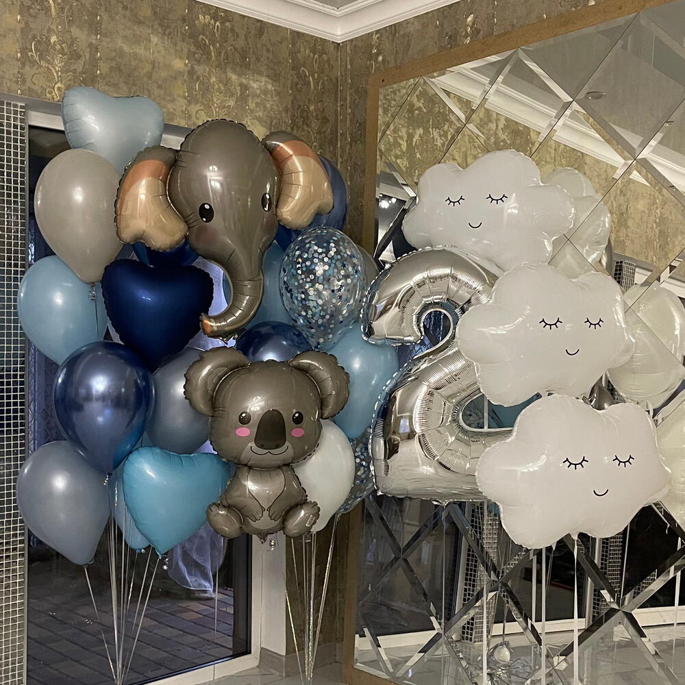 Included in the set: Number 3 figures: cloud 1 figure: elephant 1 figure: koala 1 bouquet of 16 balloons ( 3 hearts 45cm, 5 balloons 30cm chrome, 8 balloons 30cm pastel) 1 bouquet of 10 balloons ( 2 balloons 30cm with confetti, 4 balloons 30cm chrome, 4 balloons 30cm pastel) 7 weights 5 bags for transportation Total number of balloons: 32 Filling: All balloons filled with helium длина, мм: 2000 ширина, мм: 2000 высота, мм: 2000