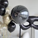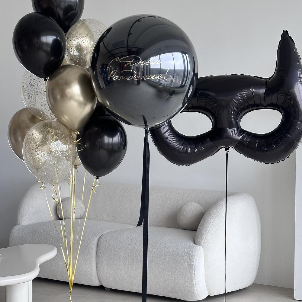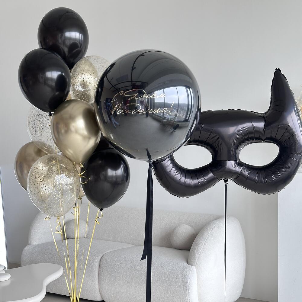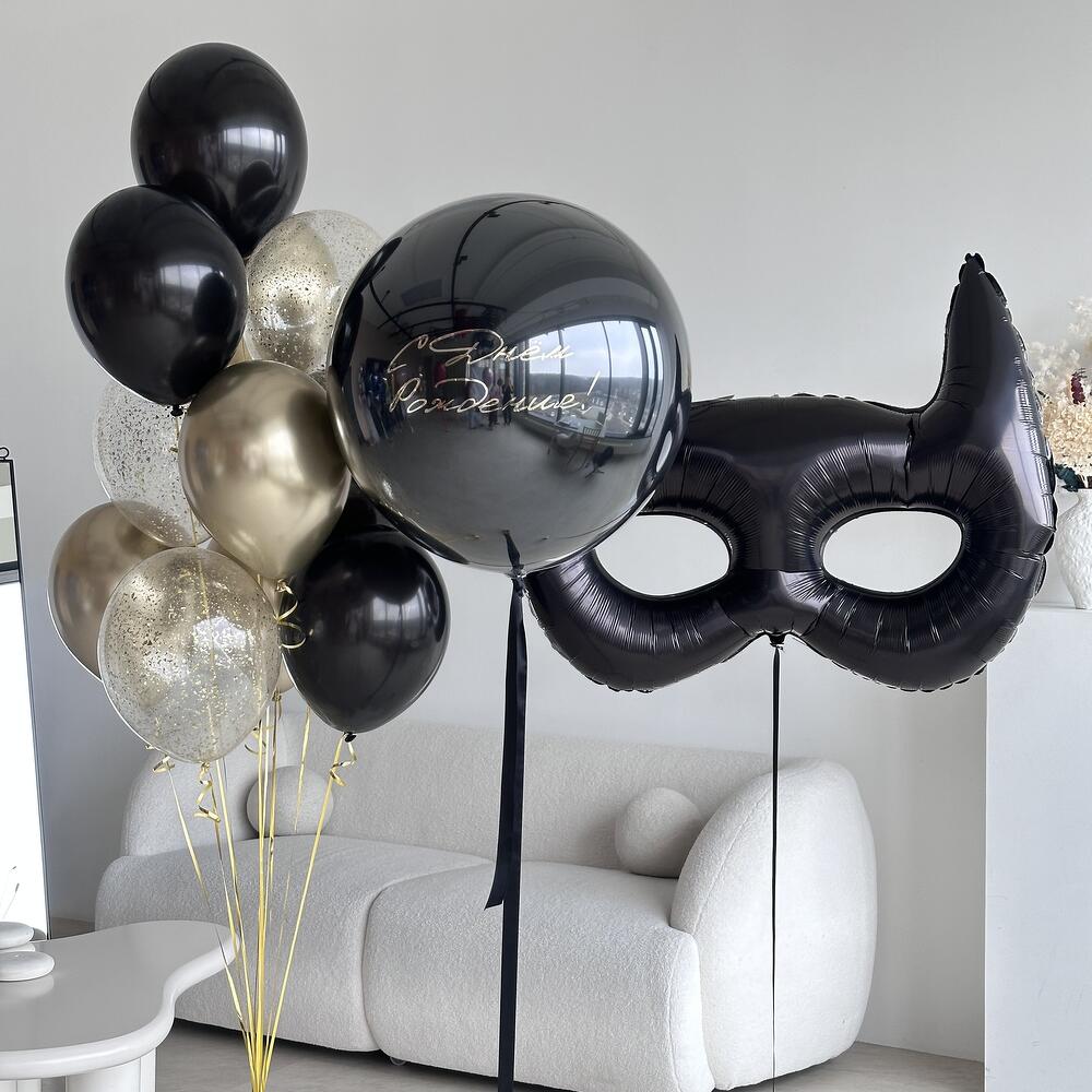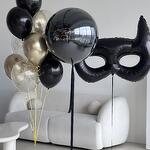 Composition: • Large Bubble balloon with an individual inscription 85 cm – 1 piece; • Foil figure “Mask – 1 piece; • 35 cm chrome latex balloon – 4 pcs; • Latex balloon regular 35 cm – 4 pcs; • 35 cm confetti balloon – 3 pcs; • Weight 3 pcs. *The inscription on the big balloon can be any (no more than 5 words). Specify it in the order comment.