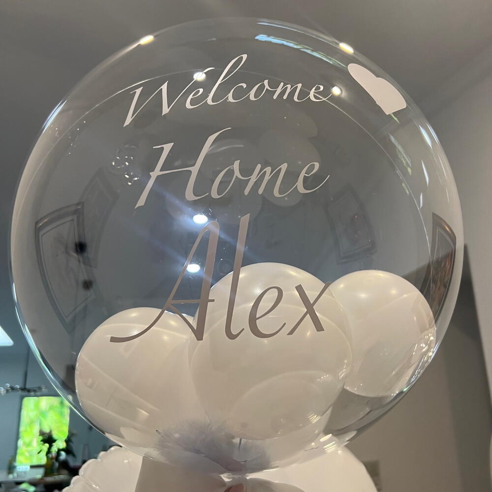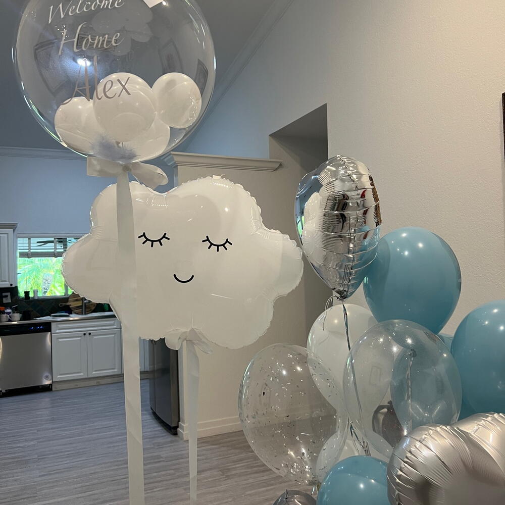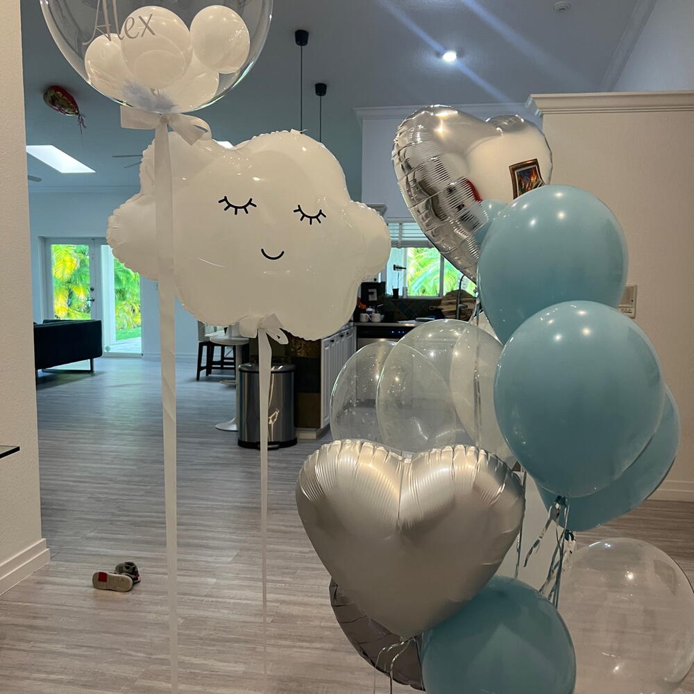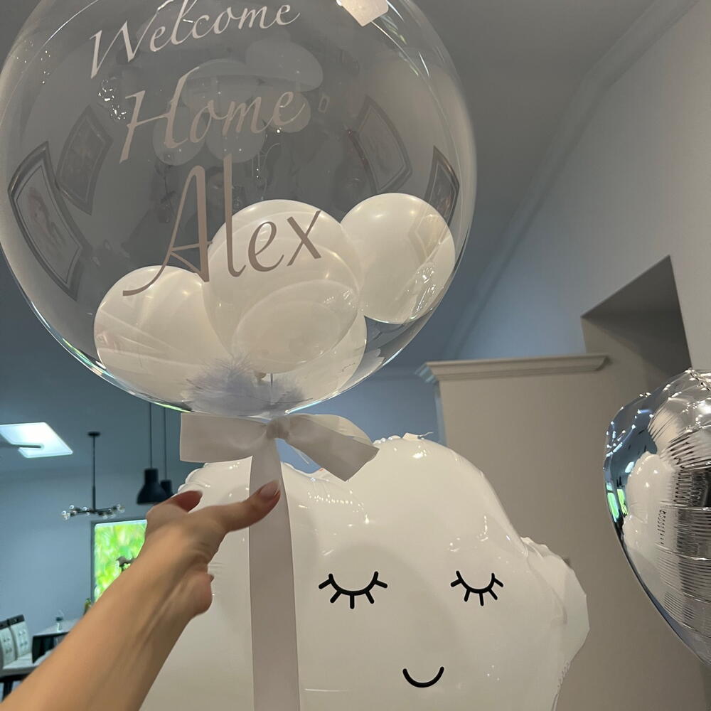 Discharging from maternity hospital Balloon set. 1 Big Glass Balloon with the writing of your choice - please mention it in the comment when ordering. 3 foil hearts, 10 latex balloons, 1 cloud