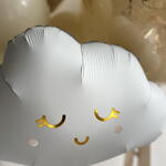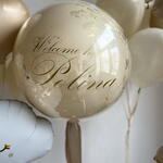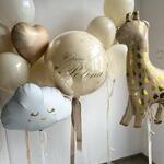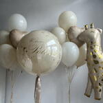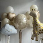 Нежен комплект в бежово-златна гама с голяма сфера и декоративни фигури. Размерът на комплекта може да бъде намален или увеличен – цената се преизчислява според избрания вариант. Просто ни напишете и ще го направим за вас. Състав: – голяма прозрачна сфера 65 см с персонализация и златни елементи – фолийно облаче – фолийна жирафка – 2 връзки балони: • 3 млечни • 3 пясъчни • 1 кремаво сърце