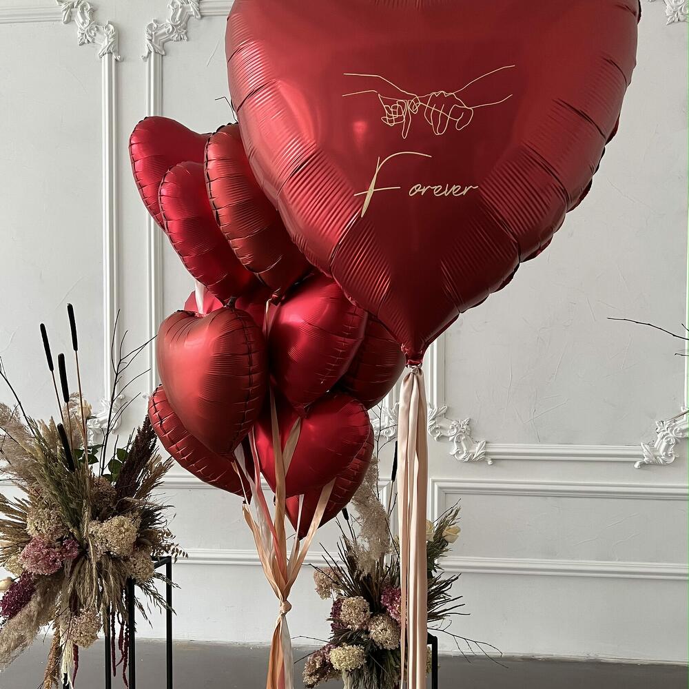 The set includes: 10 foil hearts on satin ribbons 1 XXL heart with print DETAILS Price includes: helium-filled balloons, sealing gel, ribbons, weights, transport bags.
