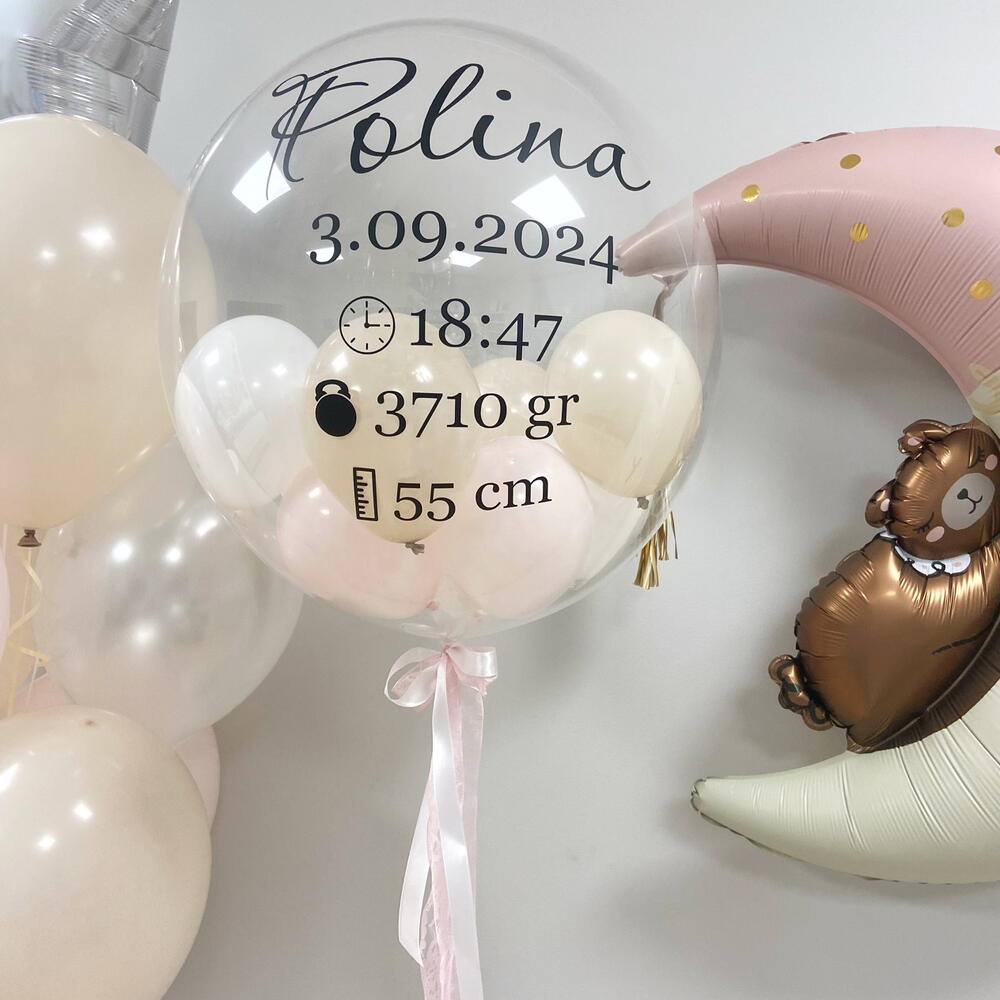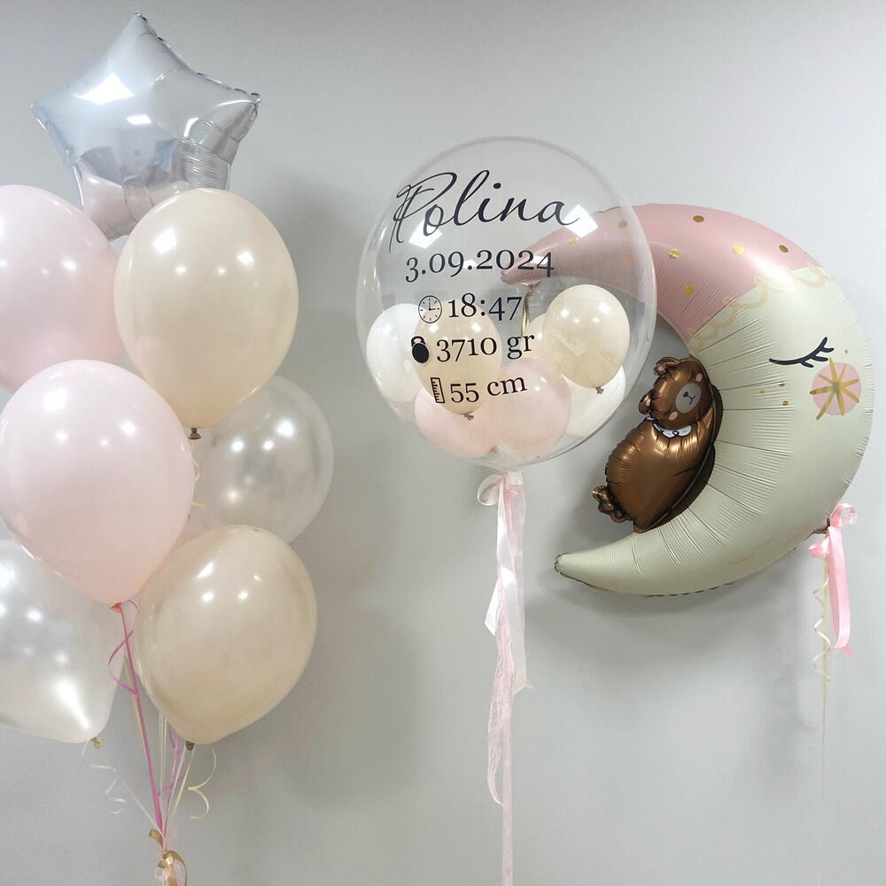 Included: 💖Transparent balloon with small balloons inside with personalized inscription 💖Balloon with a teddy bear on the moon 💖Set of latex balloons with a star on top Please specify the inscription for the balloon when placing the order. If this information is not provided, we will make a standard inscription "Welcome home!"