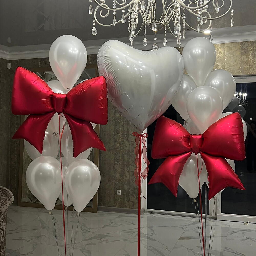 Set includes: 2 clusters of 10 balloons (each: figure: bow , 9 pearl balloons 30cm ) 1 heart 90cm 3 weights 3 transport bags Total number of balloons: 21 Filling: All balloons with helium длина, мм: 2000 ширина, мм: 2000 высота, мм: 2000