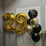 2 number balloons 92 cm 1 balloon with inscription 1 confetti 3 black balloons 3 gold balloons