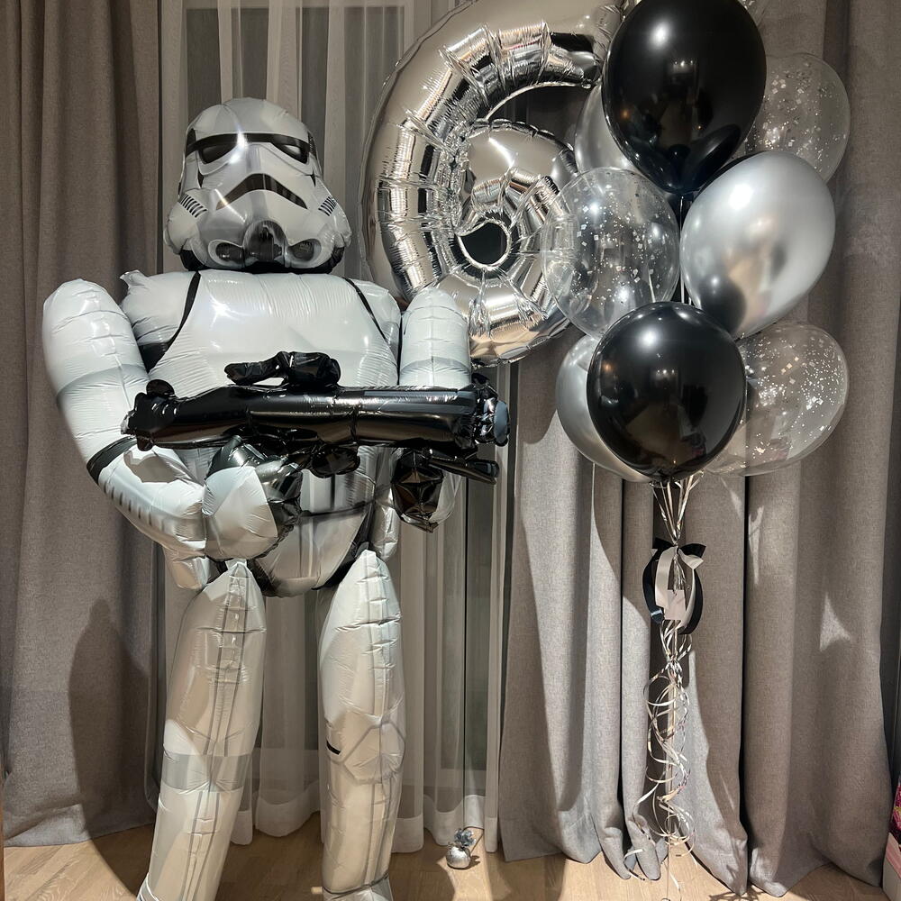 Included in the set: Number balloon Figure: Stormtrooper 1 bouquet of 10 balloons ( 4 balloons 30cm with confetti, 3 balloons 30cm chrome, 3 balloons 30cm pastel) 3 weights 2 bags for transportation Total number of balloons: 12 Filling: All balloons with helium длина, мм: 2000 ширина, мм: 2000 высота, мм: 2000