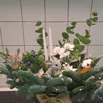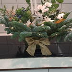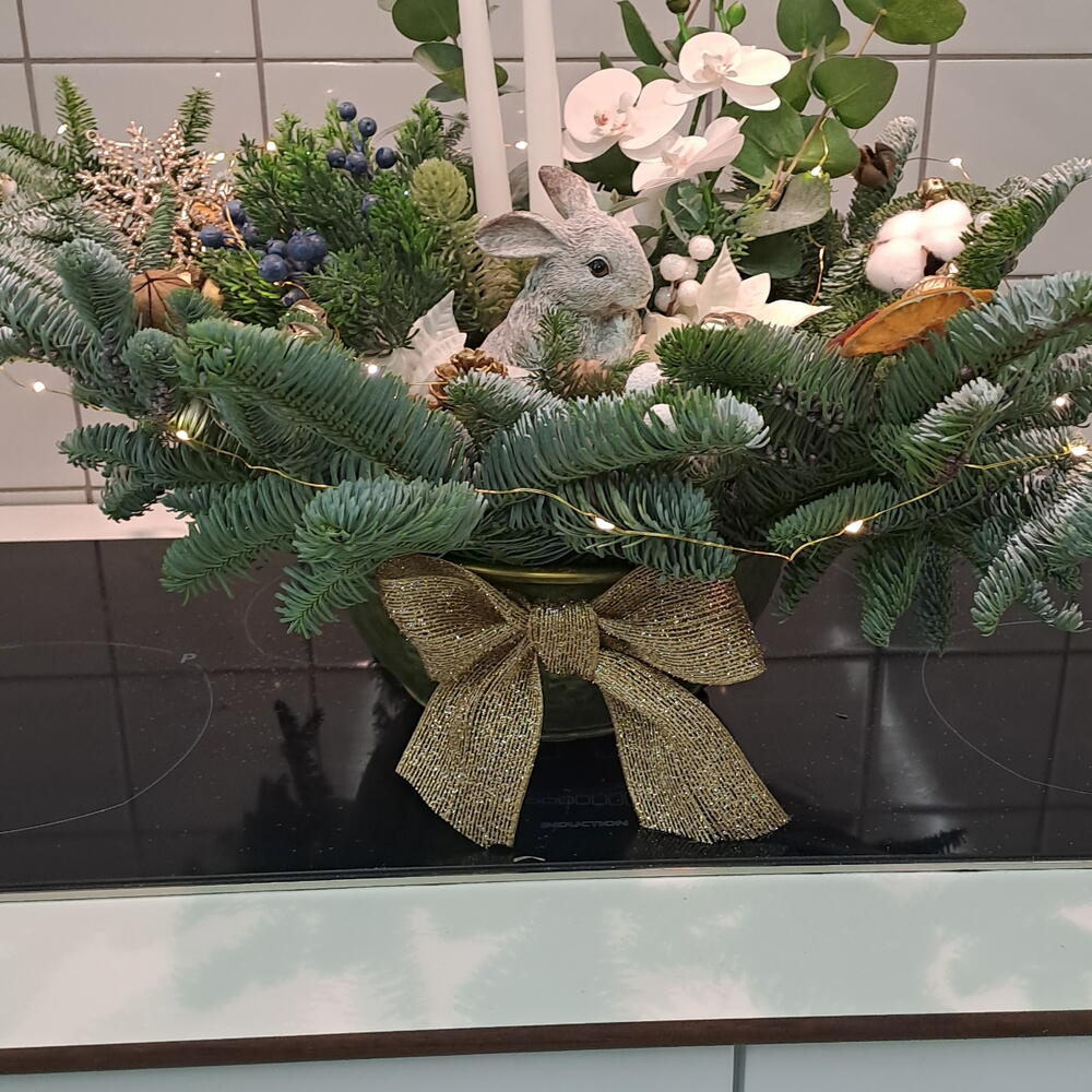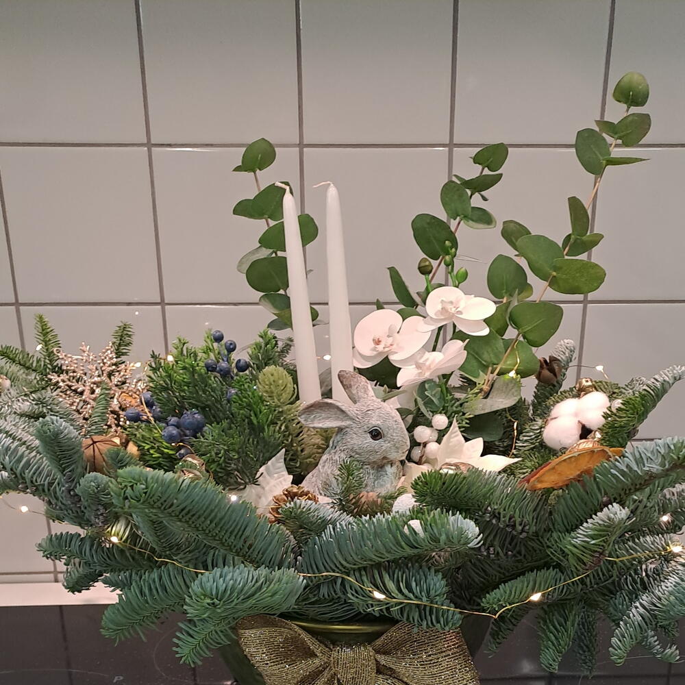 New Years composition in a cachepot with New Years decor, a card with your wishes is offered free of charge.
