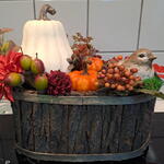 composition, a set of pumpkins in a pot with decorative leaves and berries. wooden flowerpot