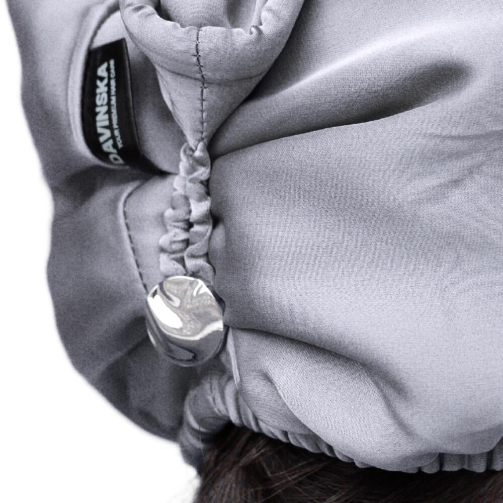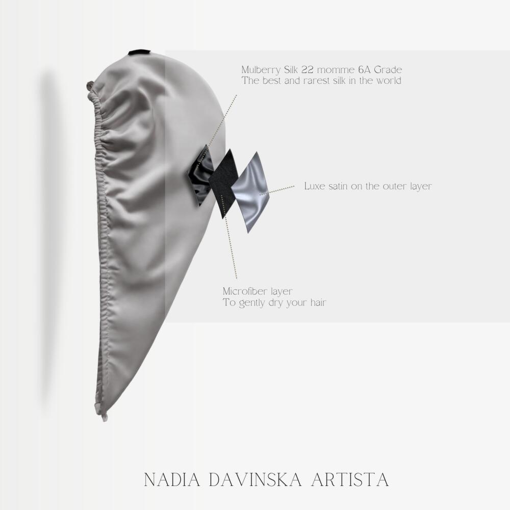 Nadia Davinska turban is a luxurious bound-to-charm gift that will bring you many happy moments of self care rituals. While being a stylish hair accessory, Nadia Davinska turban is, first of all, a comfortable and HEALTHY solution for hair drying. Its two main functions: 1) dry your hair with care and comfort. 2) improve your hair quality. Our mission is to win back those precious minutes of your life usually spent fighting your soaking hair. Focus on what matters the most while your hair is drying fast, safe, and heals with natural silk.
