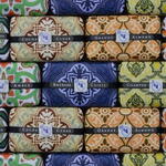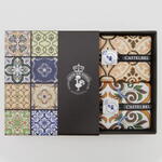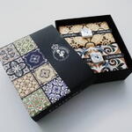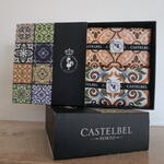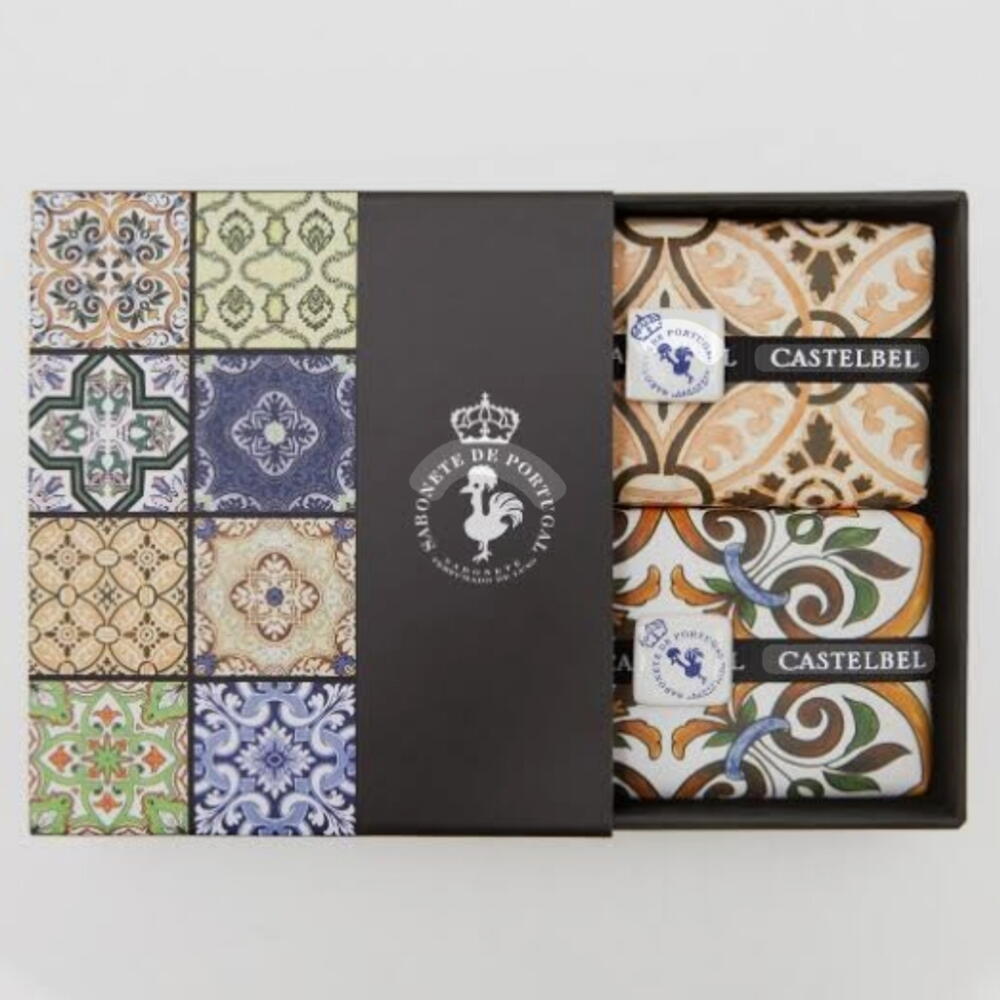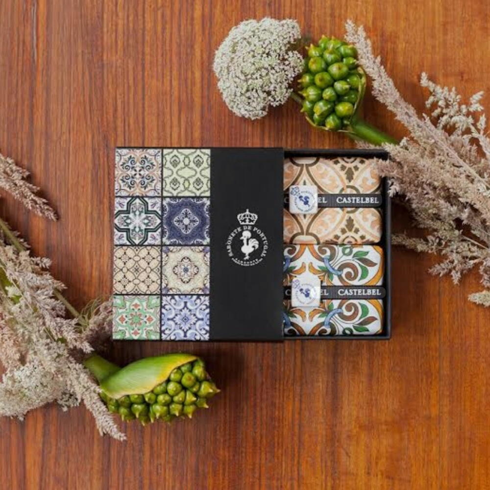 Box box cartonage details Kraft lid logo Floral wrapping paper Satin ribbon castelbel Typical Portuguese azulejo