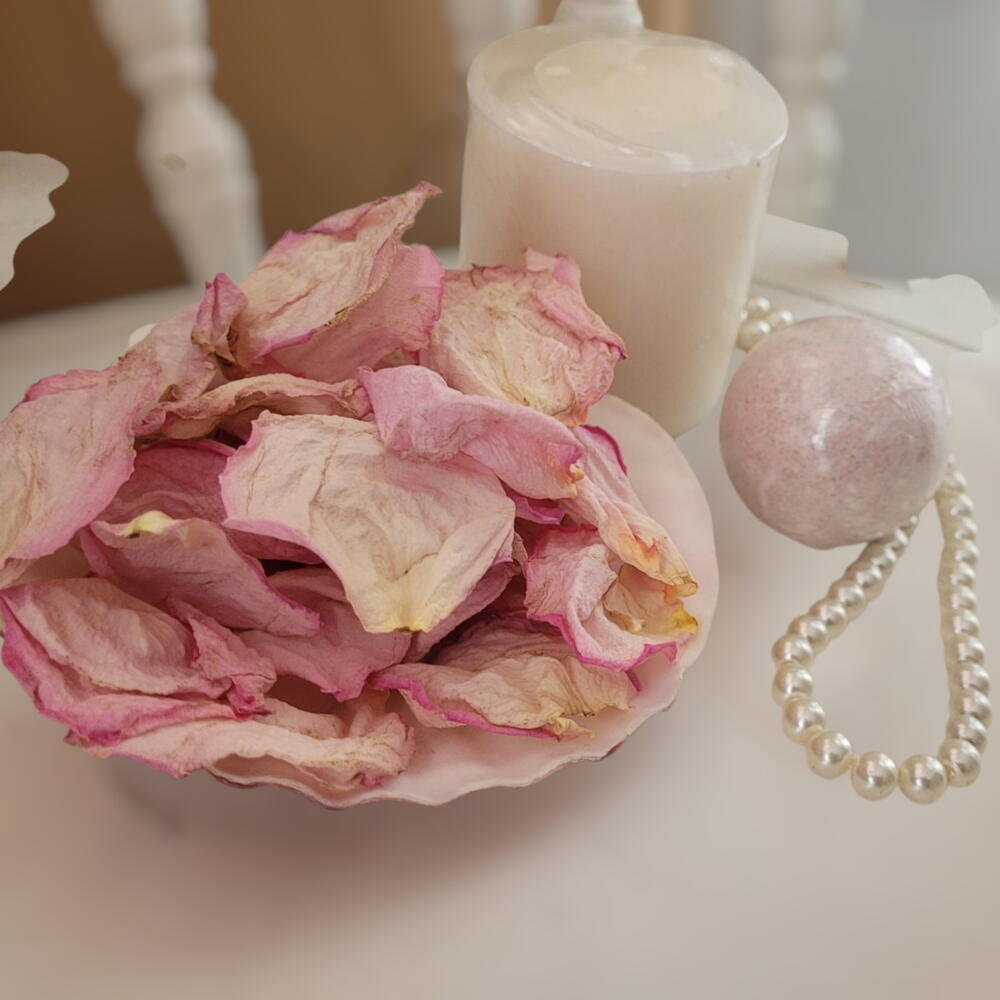 Bath bomb Dry rose petals Shell Candle Glass pearl necklace