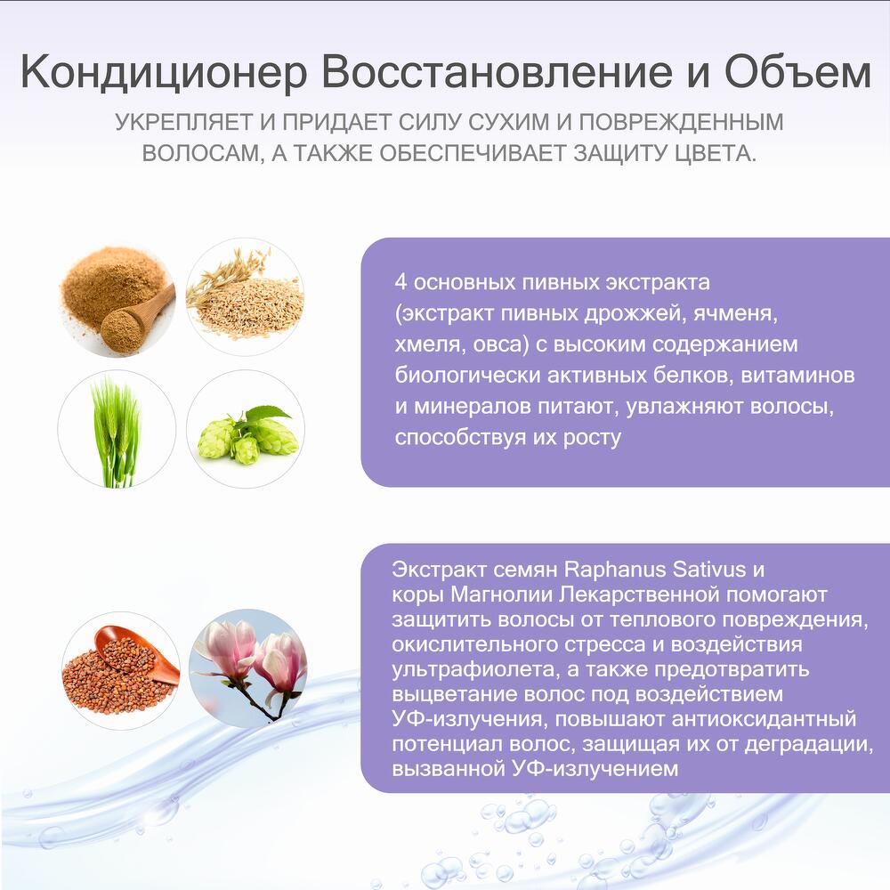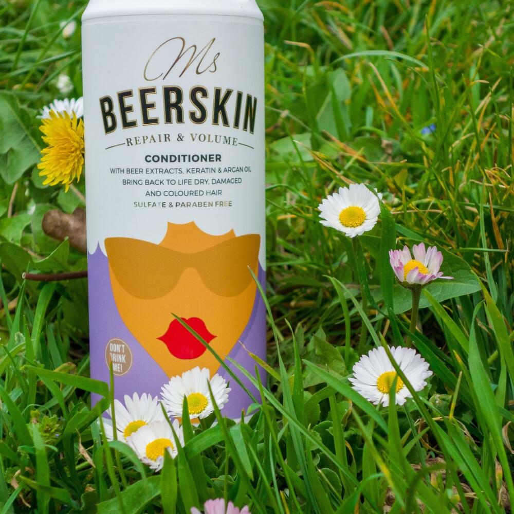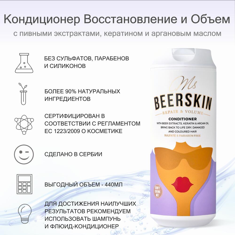 Step 2: Repair and Volume Conditioner with Beer Extracts, Keratin & Argan Oil Bring back to life dry, damaged, and coloured hair Ms Beerskin Repair & Volume Conditioner lightweight and rich formula provides superior conditioning and protection to hair without weighing it down, makes hair soft and silky, improves wet and dry combability and provides good antistatic properties. The action of Raphanus Sativus Seed Extract and Magnolia Officinalis Bark Extract are synergized to protect hair against heat damage, prevent UV-induced color fading, increase hair antioxidant potential and protect it from UV-induced degradation. It contains 4 main Beer Extracts (hydrolyzed yeast extract, barley seed extract, hop extract and oat extract), Argan Oil and Keratin with high proportion of biologically relevant proteins, vitamins and minerals, which help fortify hair shaft, replenishing hair's natural protein to enhance strength and elasticity. A calming mix of 15 Herbal Extracts gives a wonderful aromatic scent. The formula is free of sulfates, parabens, and silicones.