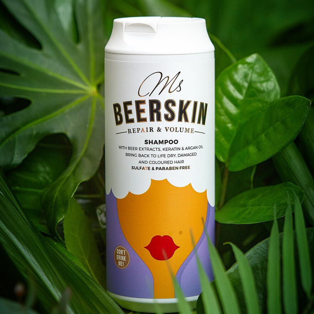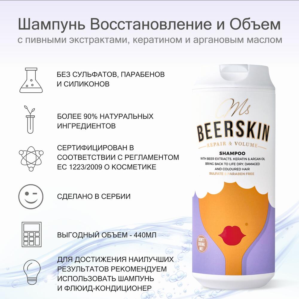 Step 1: Repair and Volume Shampoo with Beer Extracts, Keratin & Argan Oil Bring back to life dry, damaged, and coloured hair Ms Beerskin Repair & Volume Shampoo is formulated to strengthen and fortify dry and damaged hair and help to protect hair color. It contains 4 main Beer Extracts (hydrolyzed yeast extract, barley seed extract, hop extract, and oat extract) with a high proportion of biologically relevant proteins, vitamins, and minerals. Hydrolyzed Keratin, Wheat Protein and Argan Oil provide effective repair, help to protect hair from damage and split ends, enhance hair gloss and smoothness. Thymus Vulgaris and Camellia Sinensis Leaf Extracts work in synergy with D-Panthenol, which prevents hair damage, thickens hair, improves luster and sheen, and acts as a long-lasting hair moisturizer, while Allantoin being keratolytic, helps moisturize hair and scalp and softens keratin, which allows the scalp and hair to hold onto moisture. A calming mix of 12 Herbal Extracts gives a wonderful aromatic scent. The formula is free of sulfates, parabens, and silicones.