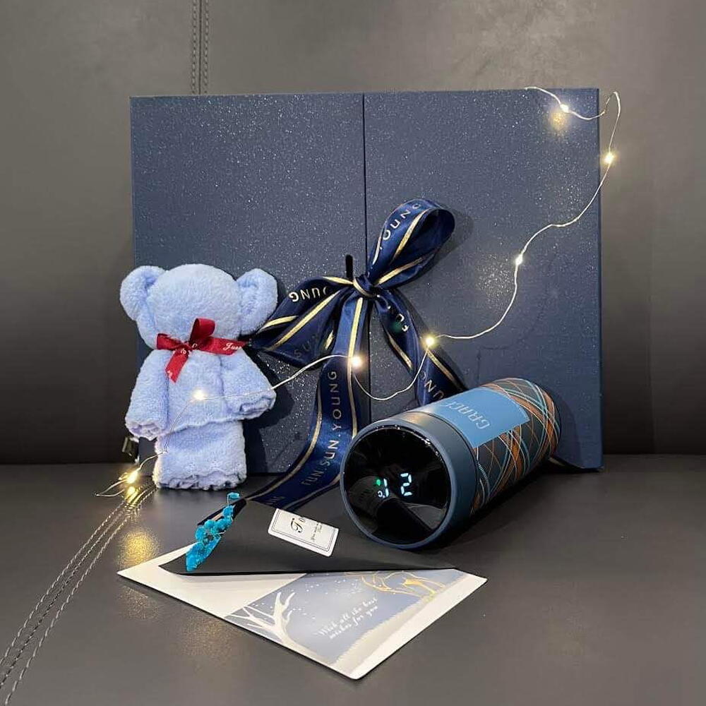 Delight someone special with this premium 5-in-1 Blue Gift Hamper, beautifully packed with a curated selection of thoughtful items in a stylish blue theme. Whether it’s a birthday, celebration, or a heartfelt thank-you, this all-in-one hamper is sure to make a lasting impression. What’s Inside: 🔹 Blue Ceramic Mug – Sleek and elegant for daily sipping 🔹 USB Mug Warmer Plate – Keeps drinks warm and cozy 🔹 Scented Candle – Fills the room with calming aroma 🔹 Mini Blue Teddy Bear – A soft, sweet companion 🔹 Greeting Card – Add your personalized message 🎁 Comes in a coordinated luxury gift box—ready to gift, no wrapping needed! Perfect For: 🎂 Birthdays | 💙 Him or Her | 🎉 Celebrations | 🏠 Housewarmings | 🎁 Corporate Gifting | 💌 Just Because
