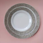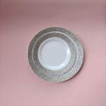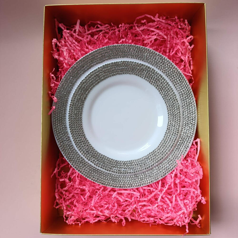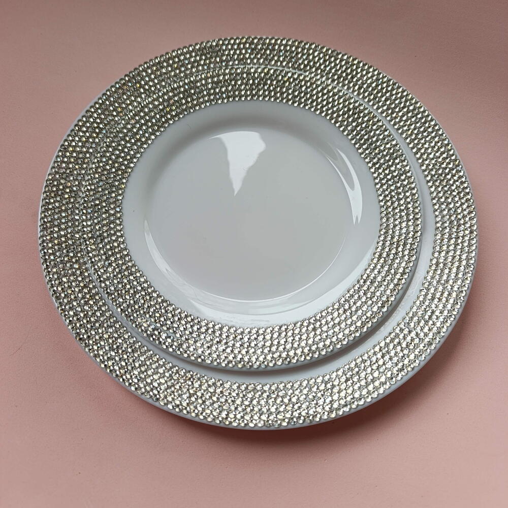 Elegant Crystal Plate Set This refined set of two round plates is adorned with sparkling crystals, adding a touch of luxury and sophistication to any table setting. The set includes one larger plate (24 cm) and one smaller plate (18.5 cm), perfectly balanced for serving desserts, fruits, pastries, or special treats. The shimmering crystal accents catch the light beautifully, making this set ideal for festive occasions, gifting, or elegant everyday use. A timeless combination of style and functionality that elevates any dining experience. Available in a gift box Not dishwasher safe