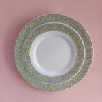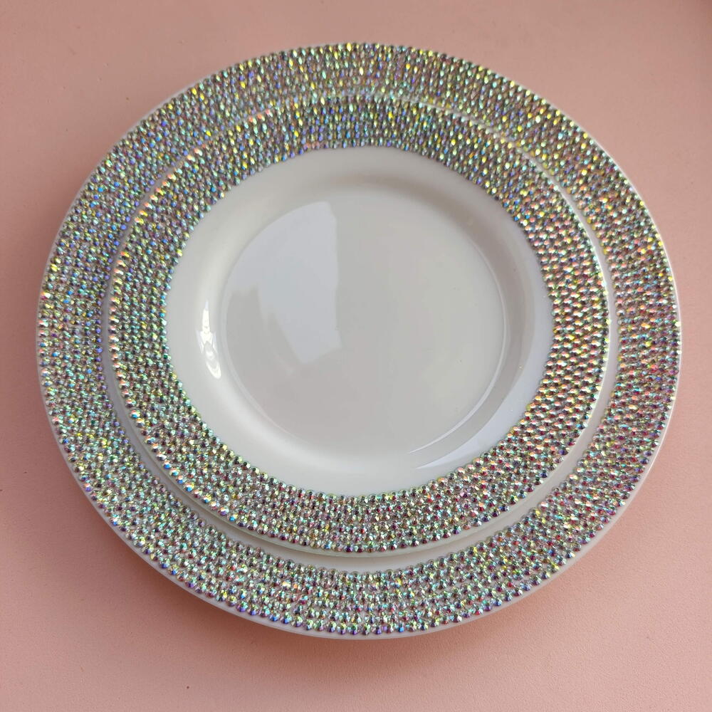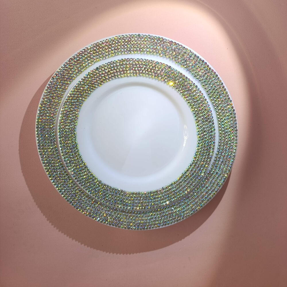 Elegant Crystal AB Plate Set This refined set of two round plates is adorned with sparkling crystals, adding a touch of luxury and sophistication to any table setting. The set includes one larger plate (24 cm) and one smaller plate (18.5 cm), perfectly balanced for serving desserts, fruits, pastries, or special treats. The shimmering crystal accents catch the light beautifully, making this set ideal for festive occasions, gifting, or elegant everyday use. A timeless combination of style and functionality that elevates any dining experience. Tempered glass. Rhinestones Not dishwasher safe. Available gift box.