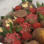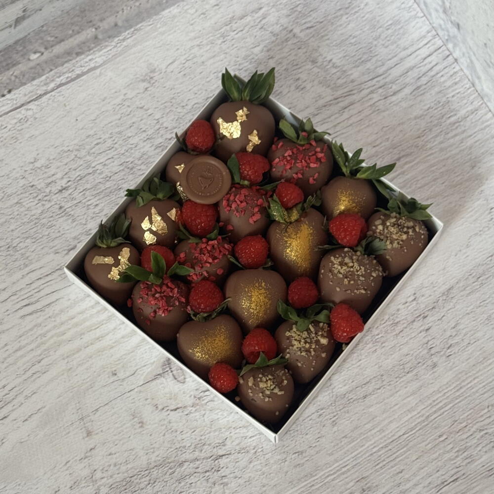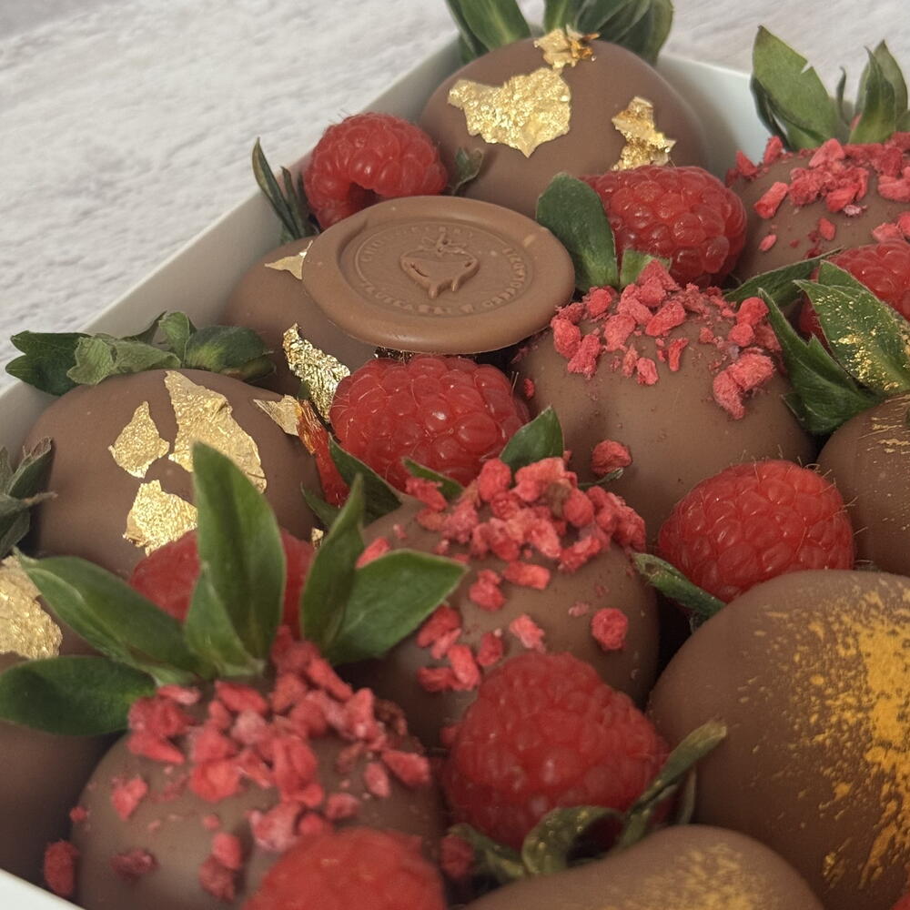 Erdbeeren, belgische Schokolade, gefriergetrocknete Himbeeren, essbares Gold, saisonale Früchte
