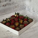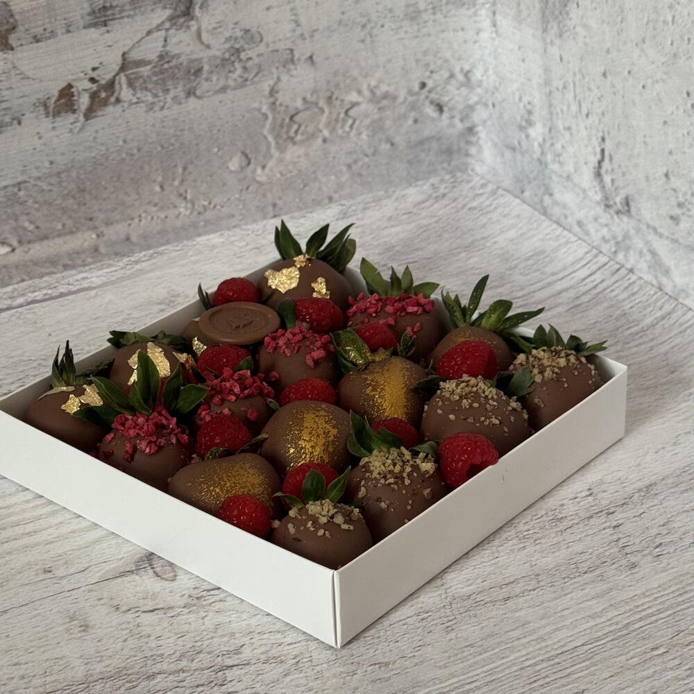 16 Erdbeeren, belgische Schokolade, gefriergetrocknete Himbeeren, saisonale Früchte