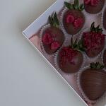 9 Erdbeeren, Schokolade nach Wahl, gefriergetrocknete Himbeeren, saisonale Früchte