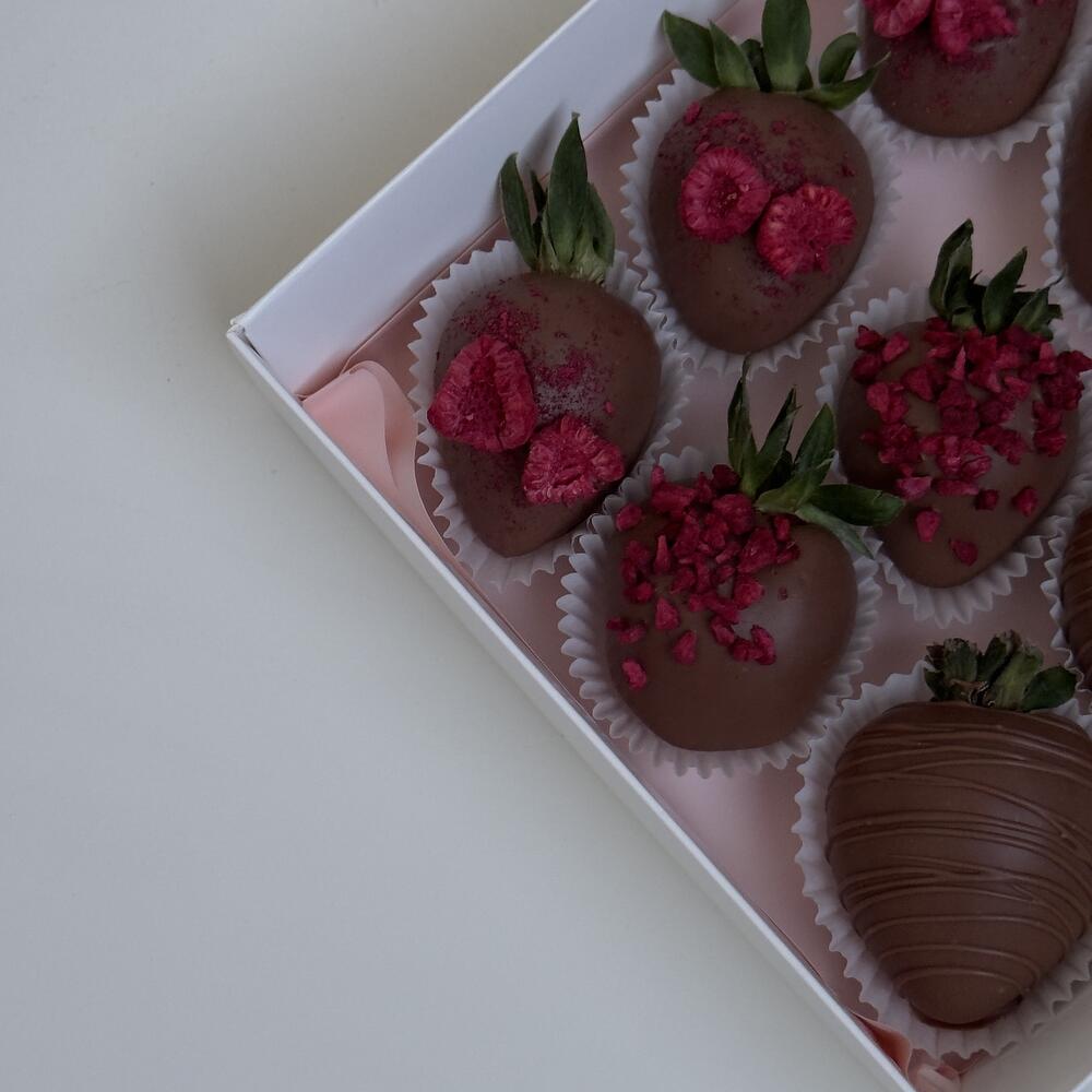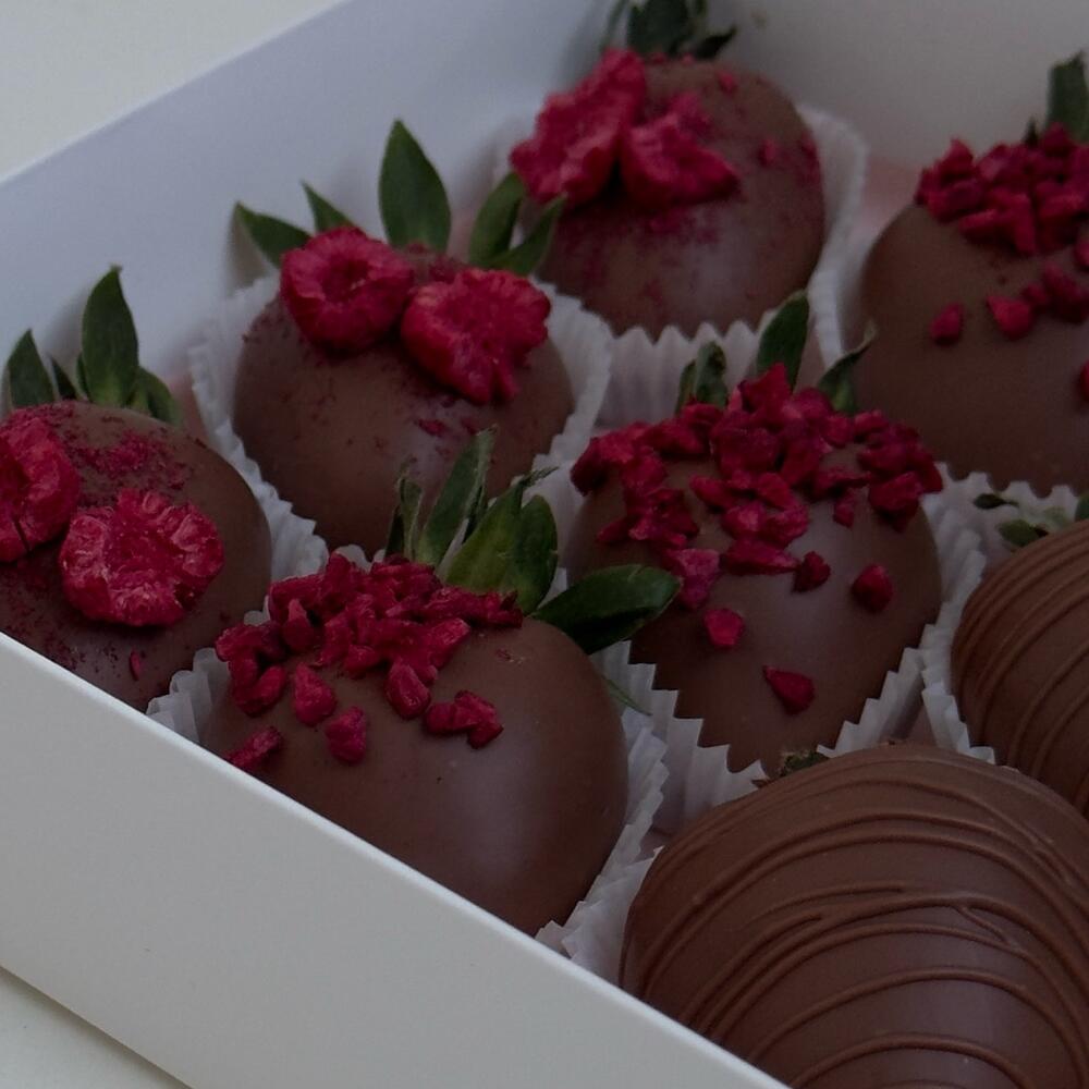 9 Erdbeeren, Schokolade nach Wahl, gefriergetrocknete Himbeeren, saisonale Früchte