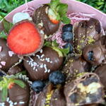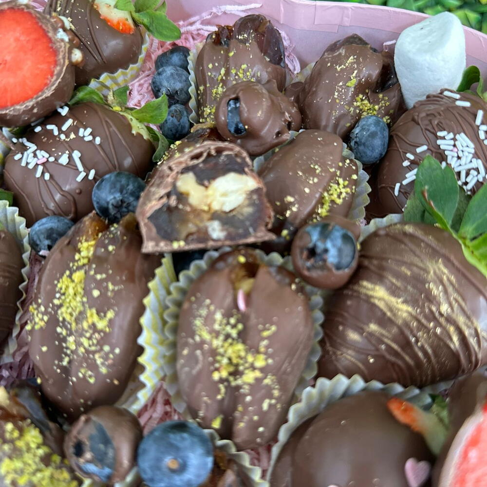 8 pieses Strawberry dipped in dark chocolate vs 8 pieses dates filled vs walnut and dipped in chocolate decorated vs blueberry and marshmallows