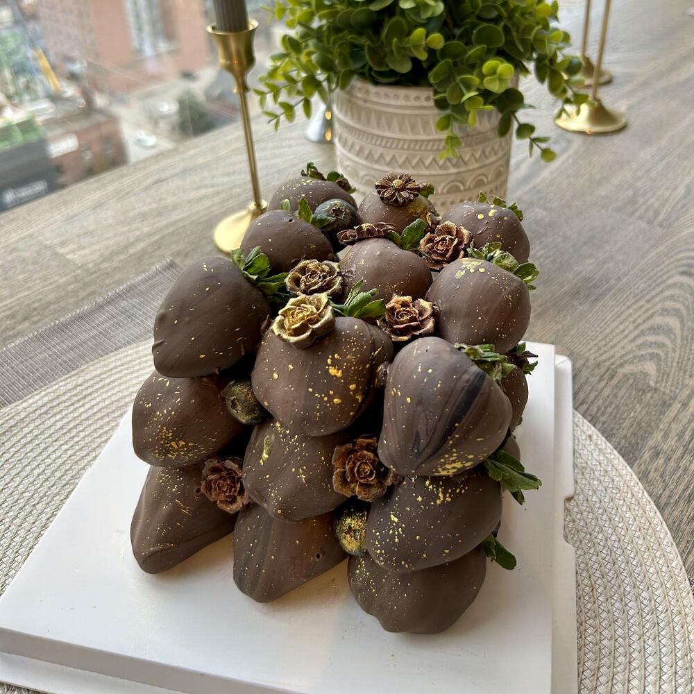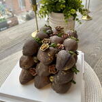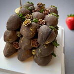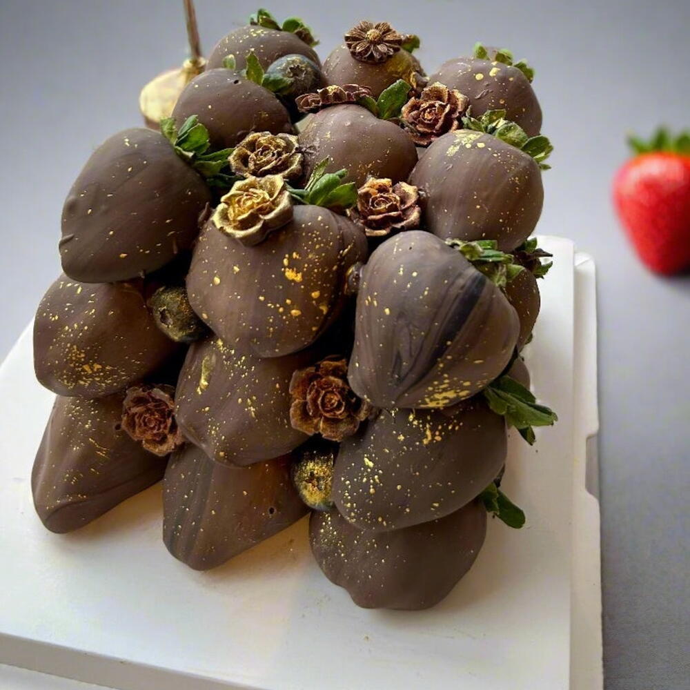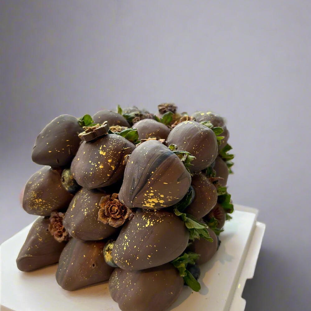 Indulge in our luxurious Chocolate-Dipped Strawberries Cube, featuring 27 perfectly dipped strawberries arranged in a sleek cube design. Each berry is coated in smooth Belgian milk chocolate infused with a touch of black food colouring for a rich, elegant finish. Beautifully decorated, this cube makes a stunning centrepiece for any celebration or special occasion. Please note: The topper “Happy Birthday” is not included.