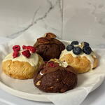 Мука, тростниковый сахар, сливочное масло, яйца, сливки, сахар, малина, вишня, арахис, грецкий орех, нутелла, белый шоколад, молочный шоколад, фисташковая паста, сублимированная малина, голубика, кусочки фисташки, чайная роза