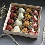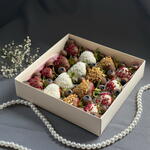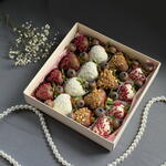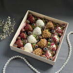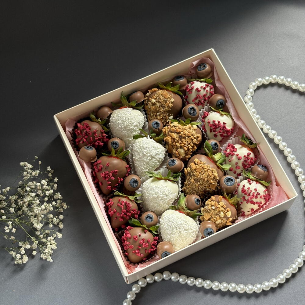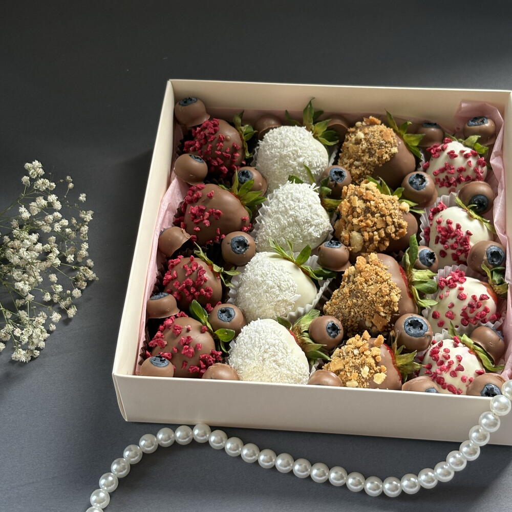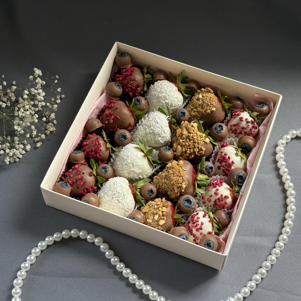 Клубника свежая Голубика свежая Шоколад молочный (сахар, какао-масло, сухое цельное молоко, соевый лецитин и натуральный ароматизатор ванили) Шоколад белый (сахар, какао-масло, сухое цельное молоко, соевый лецитин и натуральный ароматизатор ванили) Сублимированная малина Кокосовая стружка Вафельная крошка