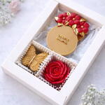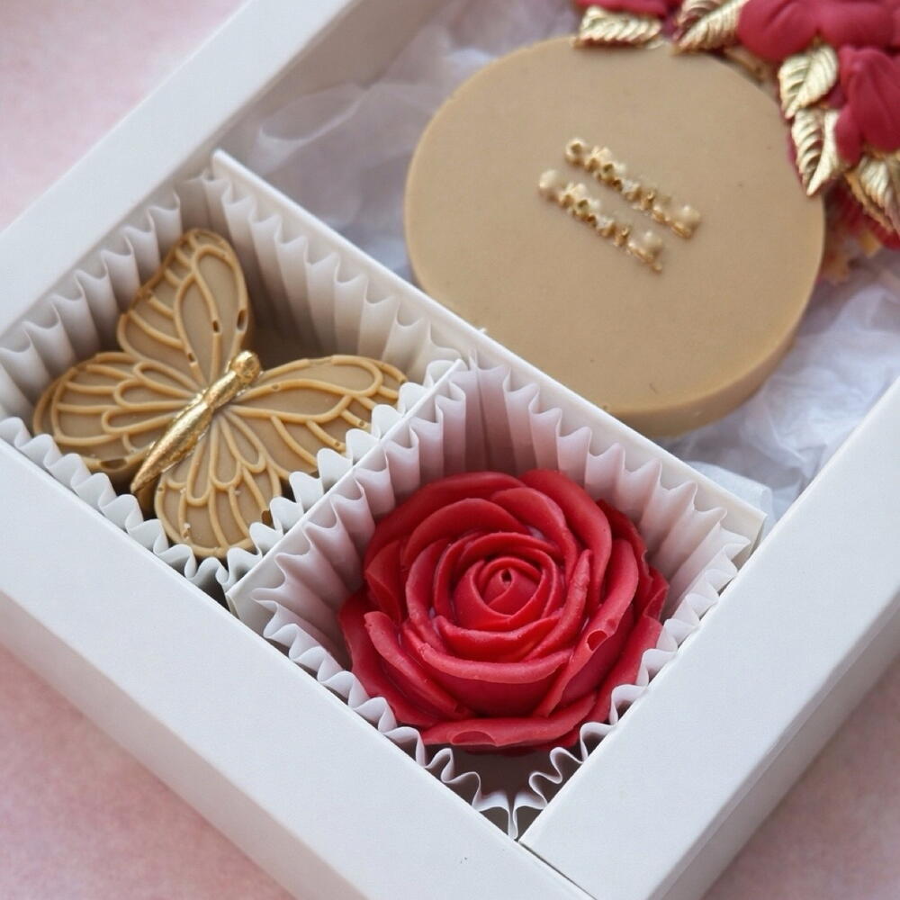 Eine elegante, handgefertigte Praline. Die Schachtel enthält zarte Pralinen in Form eines Schmetterlings, einer blühenden Rose und einer Parfümflasche, verziert mit roten Blumen und goldenen Blättern. Ein perfektes, luxuriöses Geschenk, das raffiniertes Design mit exquisiter Süße verbindet. ✨