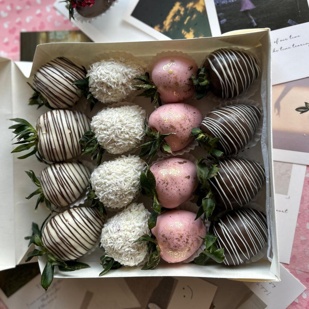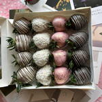 Frische Erdbeeren, weiße belgische Schokolade 33% Kakao, belgische Milchschokolade 35% Kakao, Haltbarkeitsdauer: 24 Stunden im Kühlschrank.