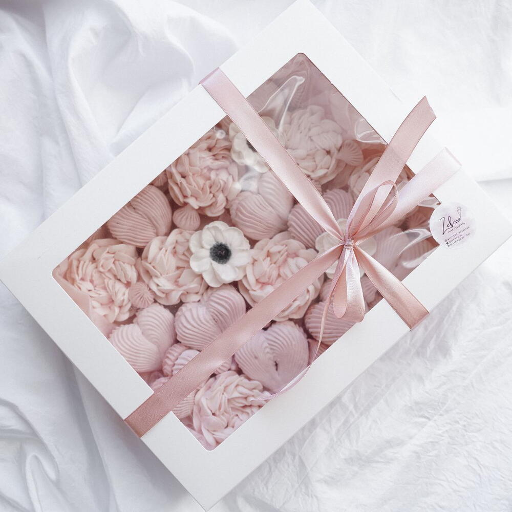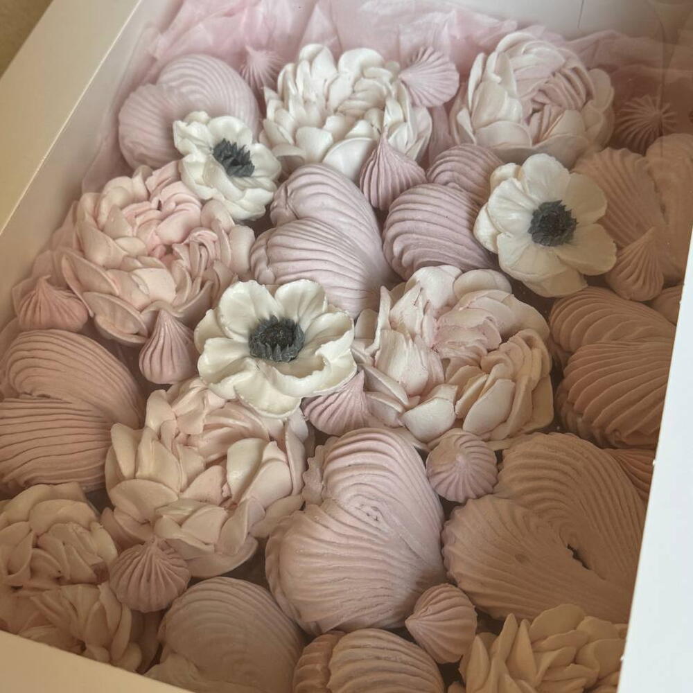 Zefirny Flowerbox in zarten, pudrigen Farbtönen — elegante, handgefertigte süße Komposition. Die Blumen sind aus Apfel-Zefir auf Basis von natürlichem Fruchtpüree mit einer zarten Vanillenote gefertigt. Die Herzchen sind aus Himbeer-Zefir auf Basis von natürlichem Beerenpüree hergestellt. In der Zusammensetzung ausschließlich hochwertige Zutaten: Frucht- und Beerenpüree, Agar, pasteurisiertes Eiweiß sowie Zucker. Konsistenz — leicht, luftig und zergehend im Mund. Die Komposition ist ästhetisch in einer Box verpackt und bereit zum Verschenken ohne zusätzliche Verpackung. Jede Box wird von Hand gefertigt, daher kann die Anordnung der Blumen leicht variieren — das macht jede Ausführung einzigartig. Das Gewicht des Produkts ist ungefähre Angabe, da die Komposition aus handgefertigten Elementen besteht und deren Anzahl leicht variieren kann. Haltbarkeit: bis zu 7 Tage im ungeöffneten Zustand.