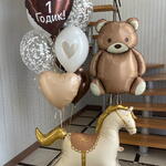 Included in the set: 1 figure: bear 1 standing figure: horse 1 bouquet of 10 balloons ( 2 hearts 45cm , 1 heart 45cm with inscription, 3 balloons 30cm with confetti, 2 balloons 30cm with hearts, 2 balloons 30cm chrome) 2 weights 2 bags for transportation Total number of balloons: 12 Filling: All balloons are helium-filled длина, мм: 2000 ширина, мм: 2000 высота, мм: 2000