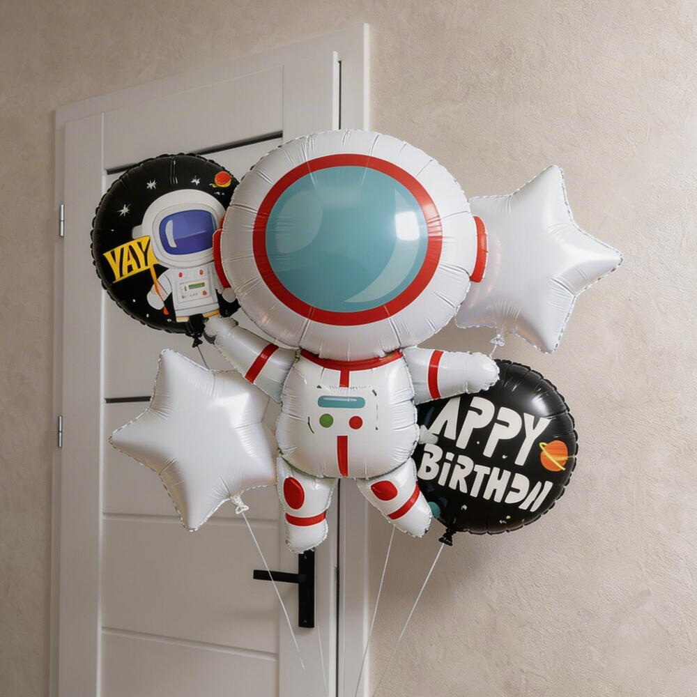 Das Set enthält 5 Folienballons: • 1x Riesen-Astronautenballon • 2x Runde Ballons • 2x Sternballons • Zubehör: Set mit dünnen weißen Bändern