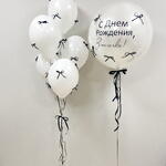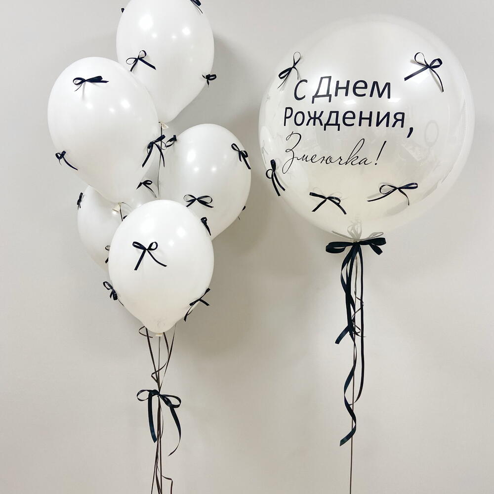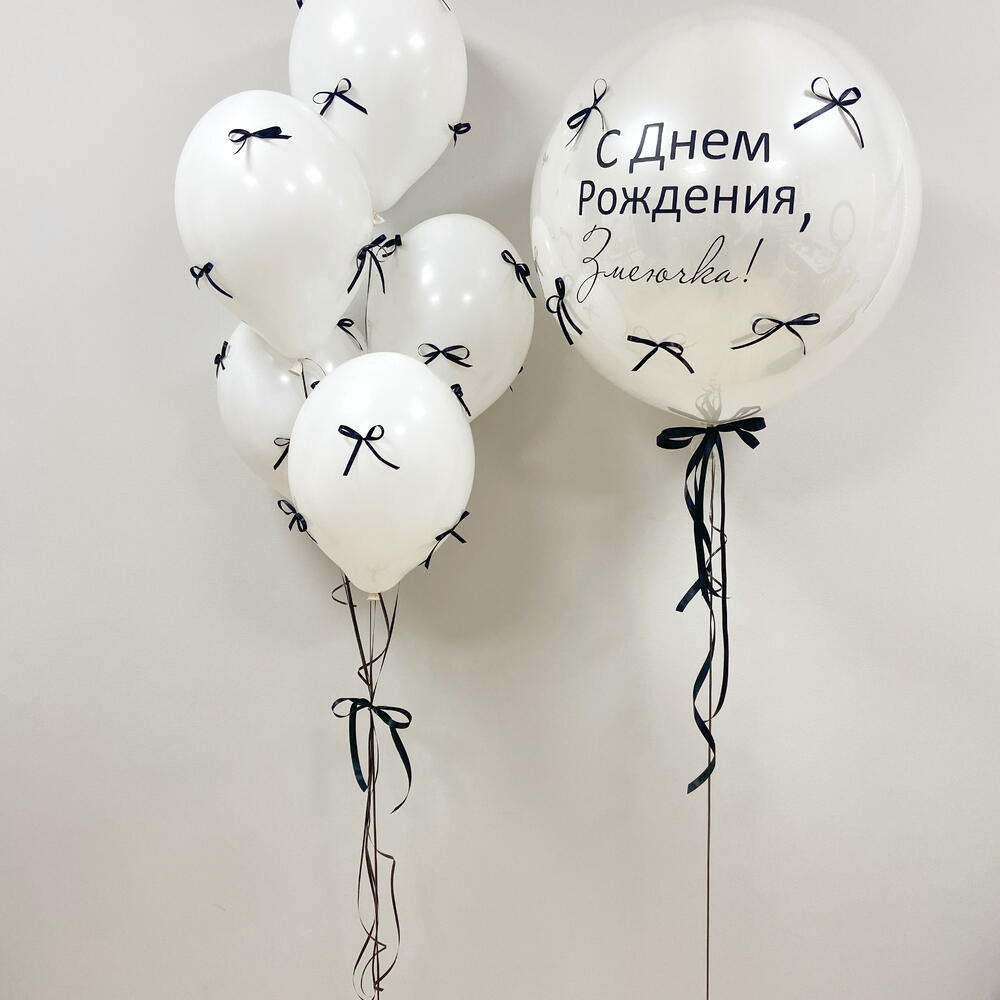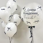 Schönes Ballon-Set in Weiß mit schwarzen Schleifen und einem großen perlmuttfarbenen Ballon mit Schriftzug. Auf Wunsch kann ein beliebiger Schriftzug angebracht werden.