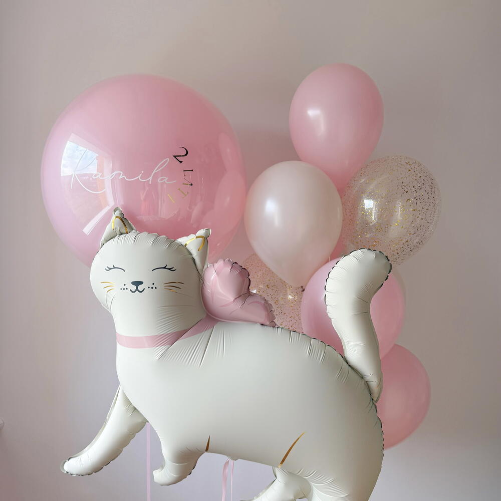 Im Preis enthalten: 7 Latexballons; 3 Ballons mit Konfetti; Double Bubble Ballon (60 cm) mit Personalisierung; Folienballon in Katzenform; Satinband; Beschwerer; Transporttaschen.