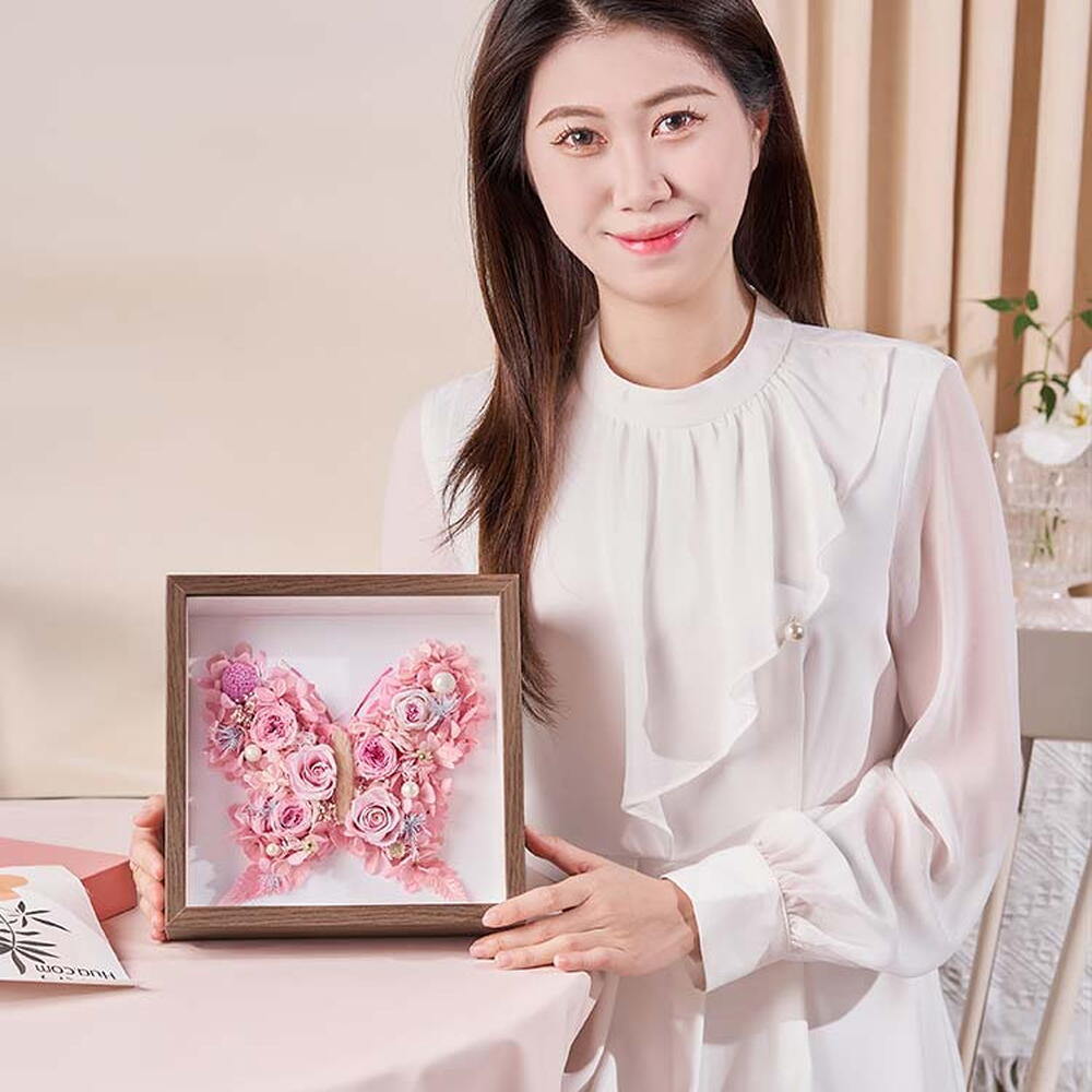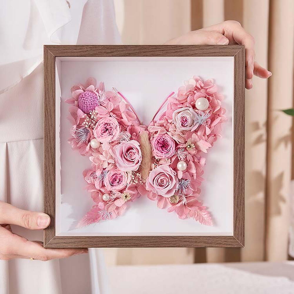 Butterfly Love Flower Eternal Flower Photo Frame - Girl Pink Blessing butterfly lives forever, and good luck comes by itself. Materials Eternal flower rose powder, 2-3cm. Austin rose white-edged pink heart 2-3cm, Austin rose pink-edged pink heart, pink hydrangea, white pearl, white full stars, blue and white fluffy pine, light purple gold ball, white leaf powder, coquelia, dog tail grass, small white flower Packaging Square 8-inch walnut photo frame Outer frame size: 21.8*21.8 cm, inner diameter size: 20.3*20.3cm (a little deviation from manual measurement, for reference only) The consonant butterfly of sun and fu It is also often read as Blessing Butterfly, which means the superposition of blessings and good luck. Selected Austin roses and pink roses, intertwined with dogtail grass and coquelo, decorated with pink hydrangea, pearls, gold balls, Full of stars and other flower materials are woven into a butterfly-shaped eternal flower picture frame. It implies that blessings are superimposed, good luck is continuous, and love can bloom forever like an eternal flower.