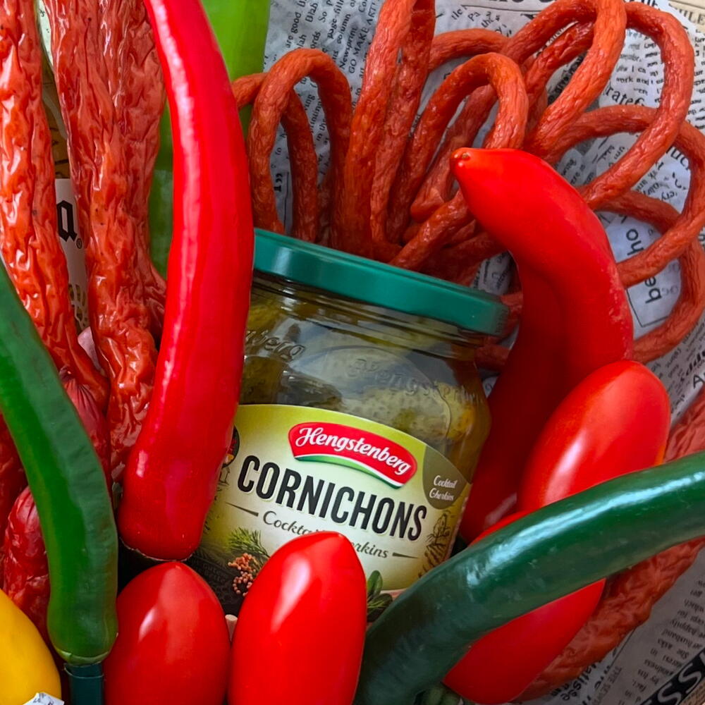 peppers - 9 Stk. tomatoes - 6 Stk. non alcoholic beer - 1 Stk. like pickled cucumbers (cornichons) - 1 Stk. sausages tarczyński or similar - 800 g