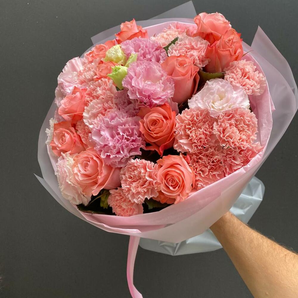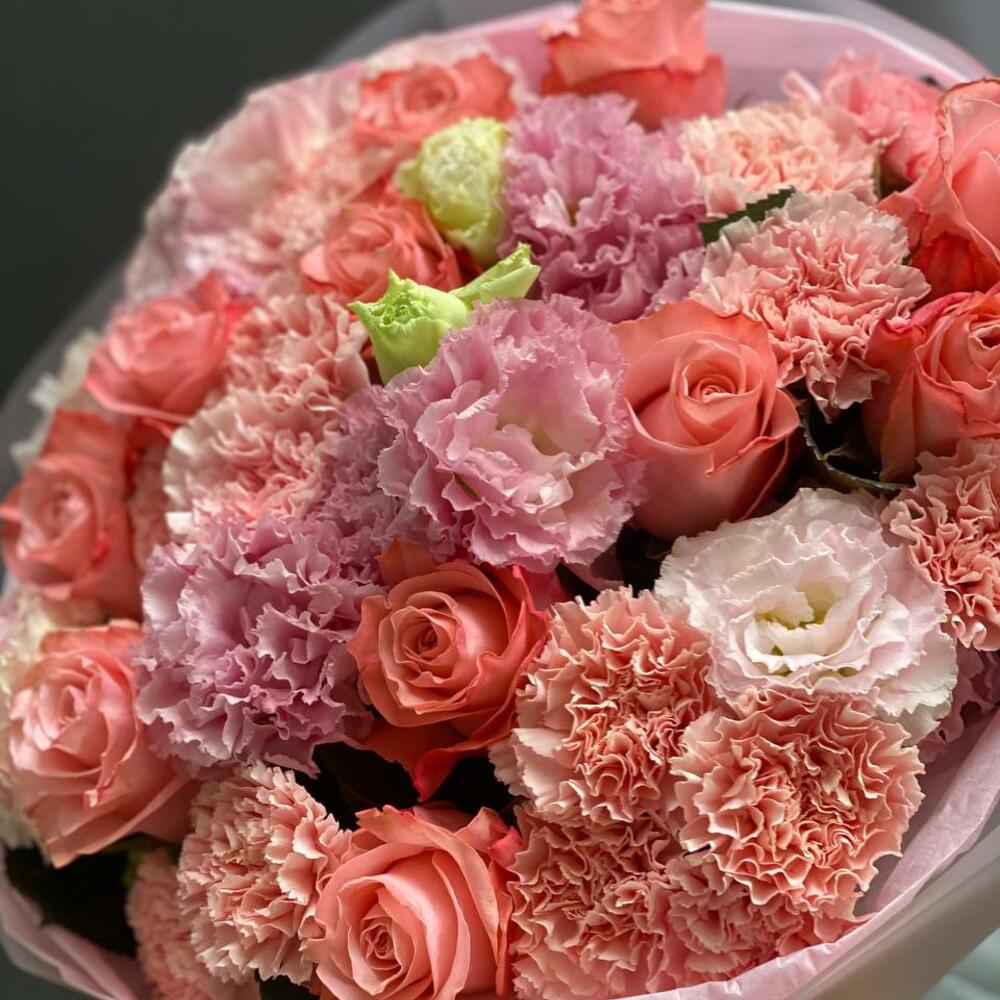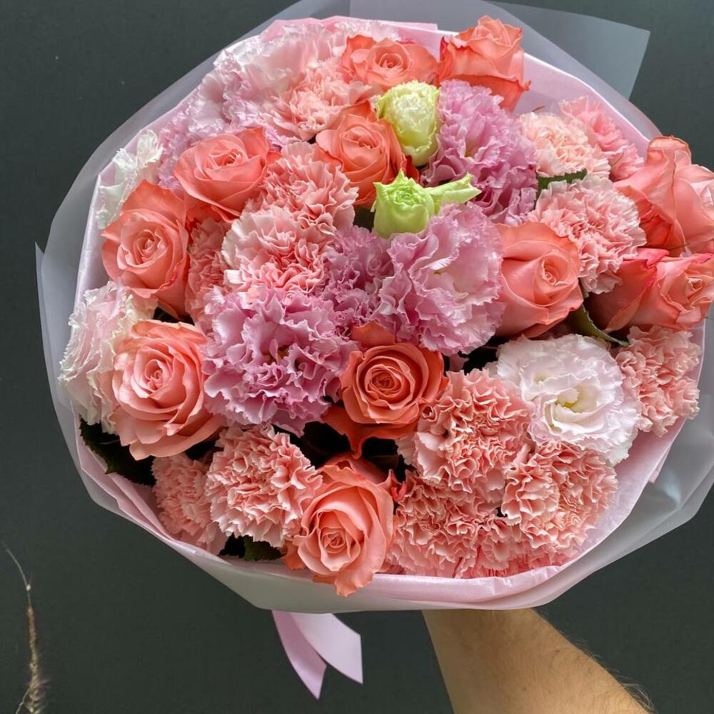 Ein Bouquet voller Zartheit – rosa Rosen, zarte Eustoma und Nelken in Pastellnuancen bilden eine harmonische Einheit voller Eleganz.