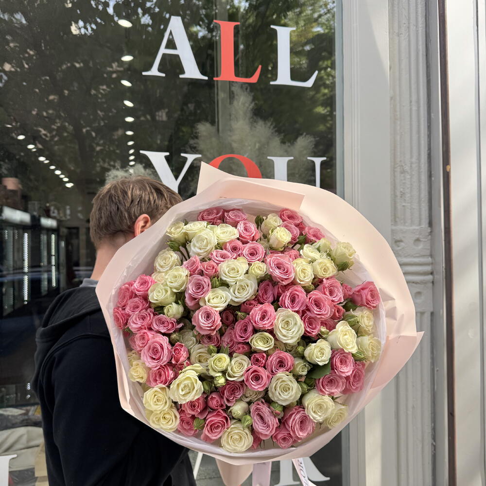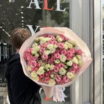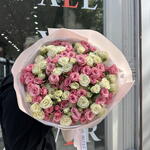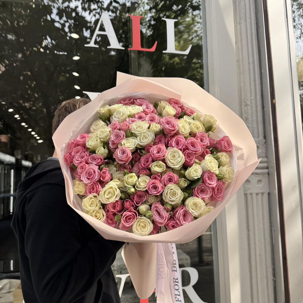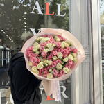 Букет красивый получился. Доставили немного позже назначенного времени, не критично для нас это было. Фото отчет сделали быстро. Доставка считаю дорогая, плюс большие розы не первой свежести были.