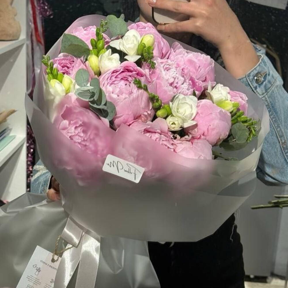 Авторский букет розовых пионов Сара Бернар с фрезией и эвкалиптом