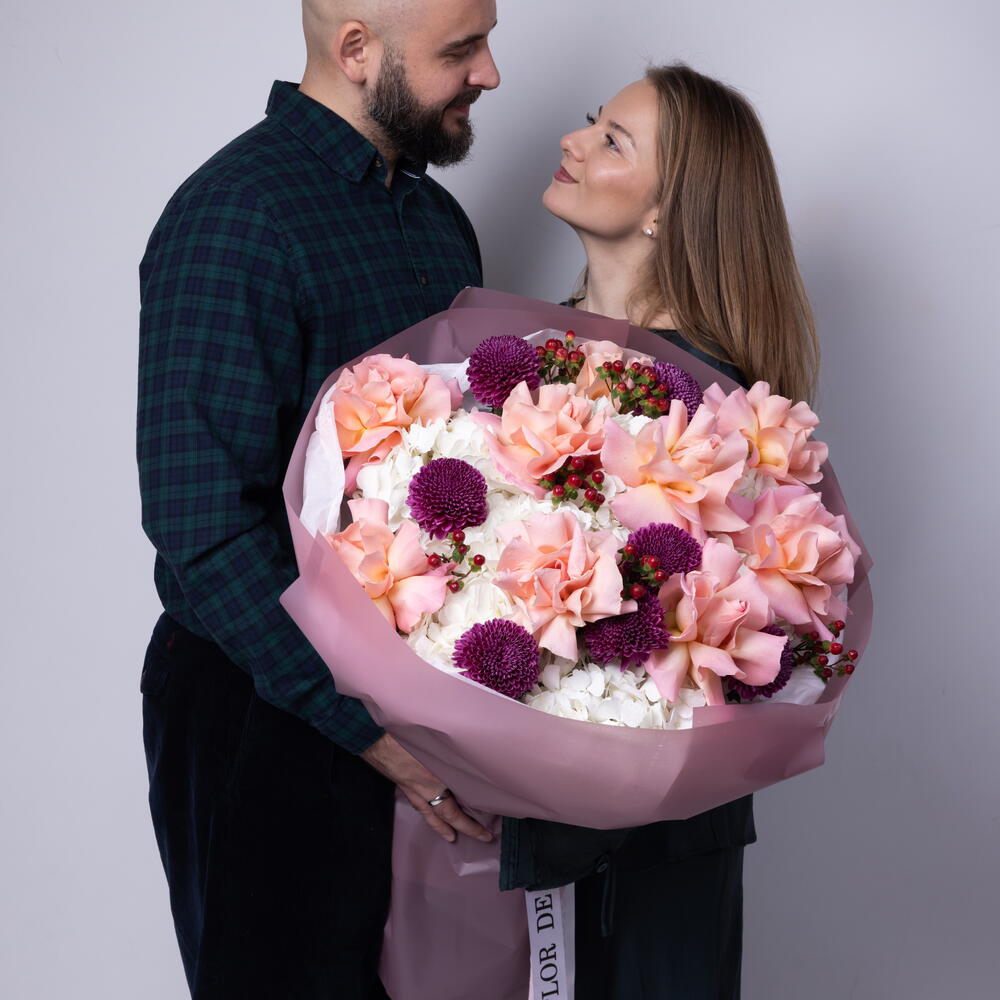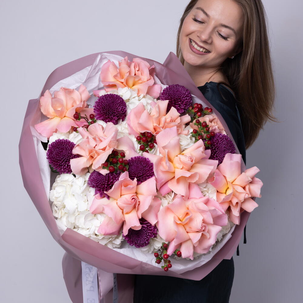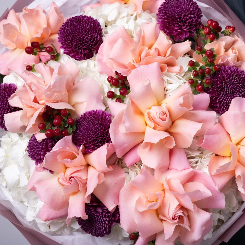 Berry Blush Bouquet (Hortensien, French Hermosa-Rosen, Beeren, Cremon Purple) Größe L