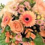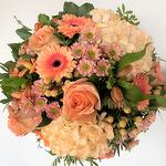 Flowers : 2x hydrangeas 4x roses 5x gerberas 5x chrysanthemums 3x berries 4x alstromerias + green Colours : salmon, white, pink Diameter : 38 cm