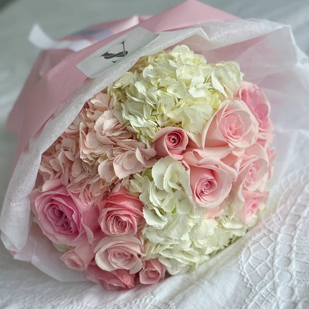 An exquisite composition of blush pink roses intertwined with voluminous hydrangeas, this bouquet embodies refined elegance and timeless beauty. Each bloom is carefully selected for its softness and radiance, creating a lush and luxurious arrangement that feels both romantic and grand. Perfect for life’s most meaningful celebrations, this bouquet makes a statement of sophistication and love.