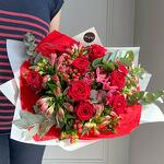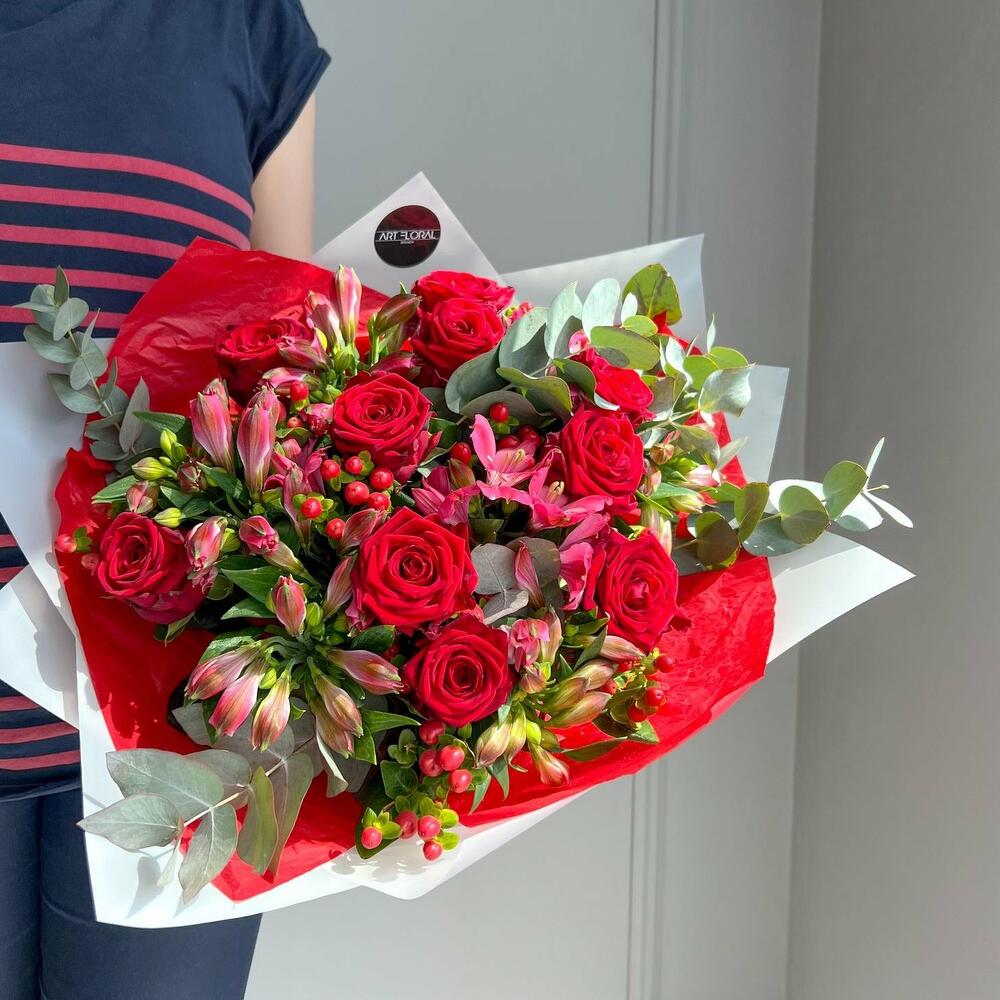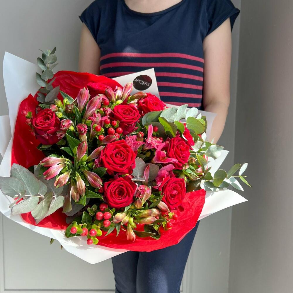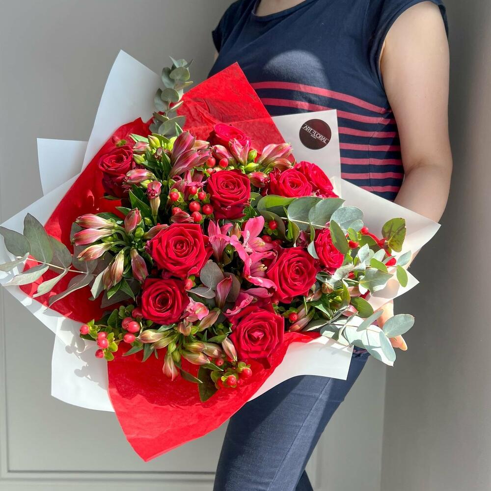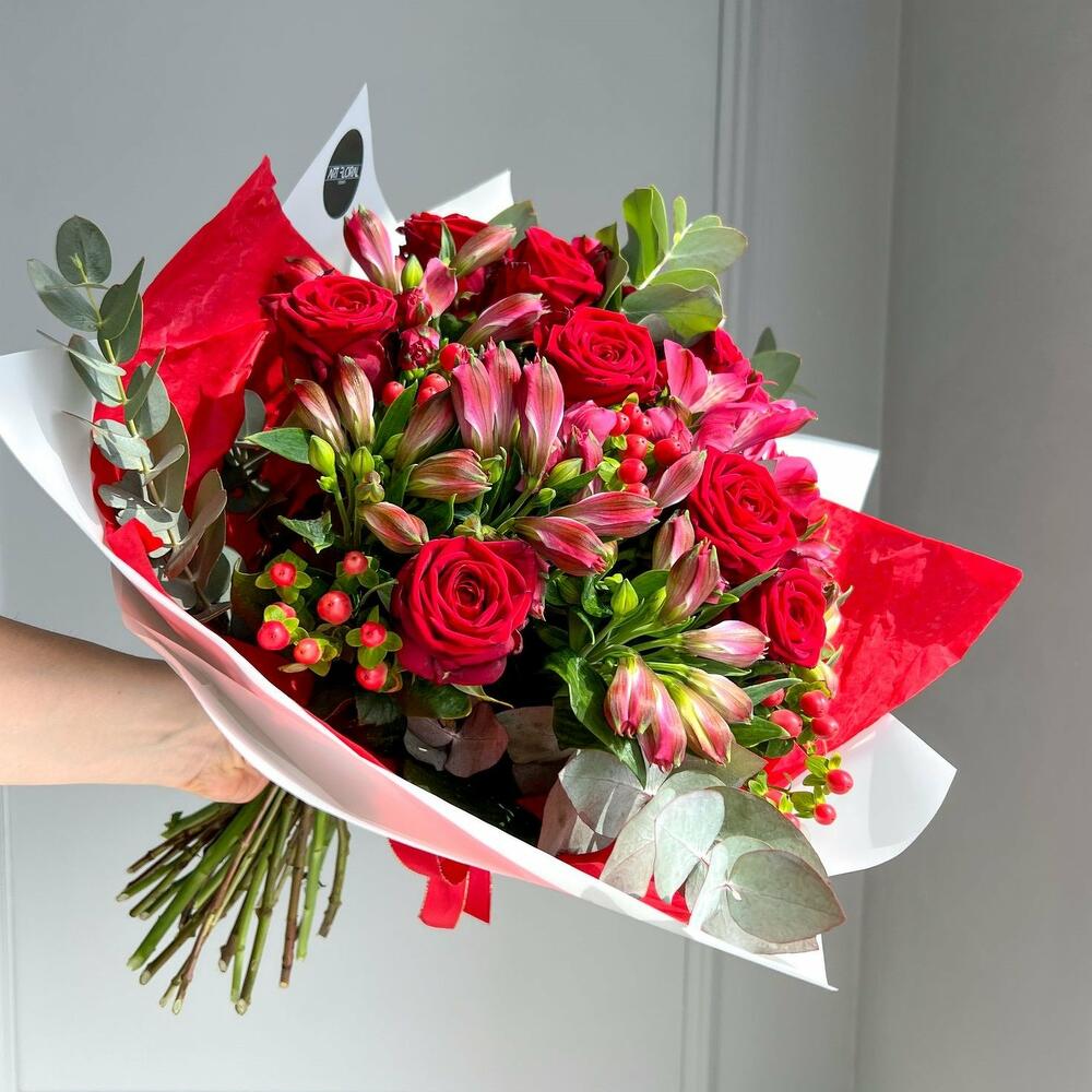 Blumenstrauß Liebe in Rot Erleben Sie die faszinierende Eleganz und den unverwechselbaren Charme unseres Straußes aus roten Rosen, Alstroemerien, roten Hypericumbeeren und Eukalyptus. Dieser üppige Strauß ist eine harmonische Komposition aus Leidenschaft, Wärme und zeitloser Schönheit, die Ihre Sinne verwöhnt und jede Gelegenheit besonders macht. Die tiefroten Rosen, Symbol für intensive Liebe und Begeisterung, setzen den kraftvollen Ton dieses Arrangements. Ihre vollblühenden Köpfe strahlen eine unnachahmliche Wärme aus und ziehen alle Blicke auf sich. Ergänzt werden sie von den lebhaften Alstroemerien, deren Farben und Muster das florale Ensemble mit einer zusätzlichen Dimension von Exotik und Frische bereichern. Die roten Hypericumbeeren fügen dem Blumenstrauß einen Hauch von Festlichkeit und Struktur hinzu, während der Eukalyptus mit seinen eleganten, silbergrünen Blättern für eine subtile Frische und ein modernes Flair sorgt. Diese Kombination schafft eine ausgewogene Mischung aus Farben und Texturen, die sowohl raffiniert als auch einladend wirkt. Ob als leidenschaftliches Geschenk für einen besonderen Menschen, als Highlight für eine feierliche Gelegenheit oder als luxuriöse Dekoration für Ihr Zuhause – dieser Blumenstrauß aus roten Rosen, Alstroemerien, roten Hypericumbeeren und Eukalyptus ist ein florales Meisterwerk, das Emotionen weckt und für unvergessliche Momente sorgt. Lassen Sie sich von der zeitlosen Schönheit und der beeindruckenden Präsenz dieses Straußes verzaubern und genießen Sie die Ausdruckskraft, die er in Ihr Leben bringt. Hinweise: Die Erstellung jedes Arrangements erfolgt individuell mit viel Leidenschaft für unser Handwerk und somit ist auch jeder Strauß ein Einzelstück und kann etwas von Abbildungen abweichen. Es handelt sich um ein Naturprodukt, dadurch sind naturbedingte Abweichungen in der Form, Farbe oder Größe zu den Angaben möglich! Jetzt ganz bequem bestellen und an Ihre Wunschadresse liefern lassen. ширина, см: 31 высота, см: 61 длина, см: 31