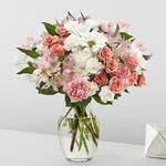 Blush Crush Bouquet (Pastel roses, mums, alstro + vase)