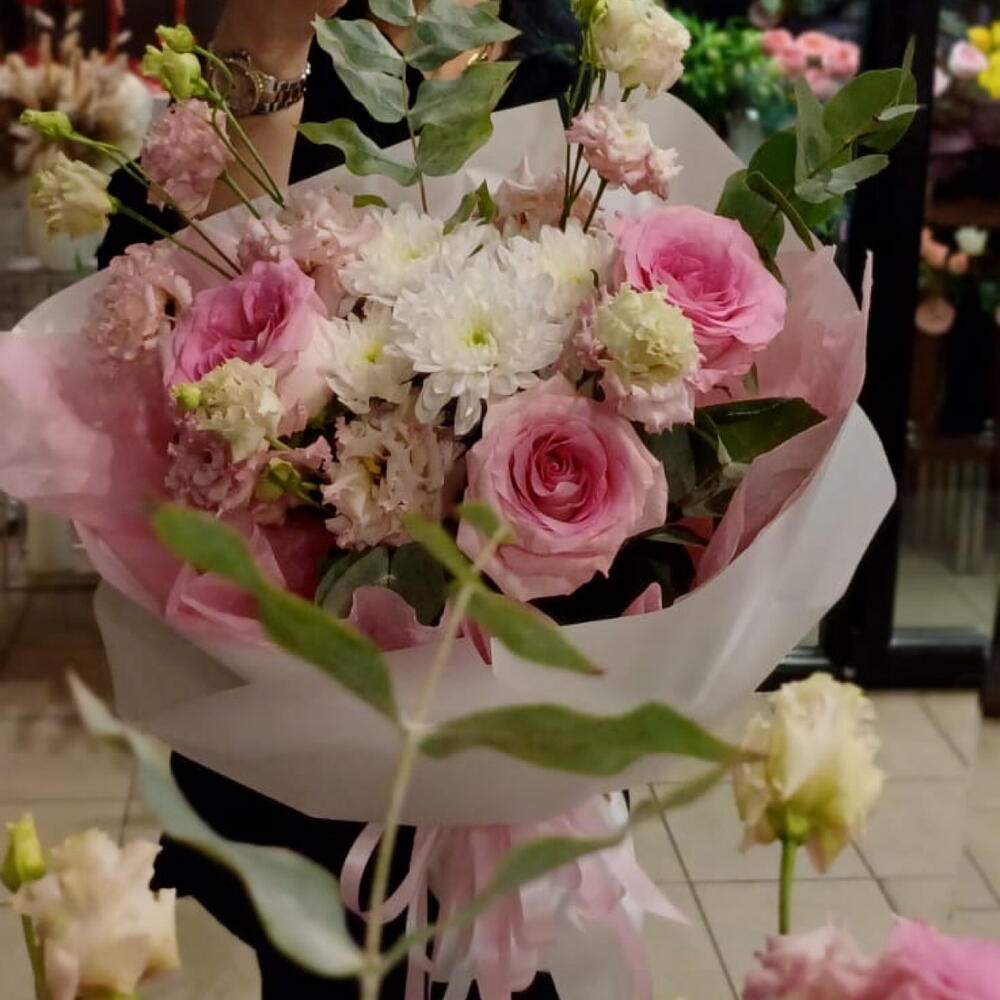 Eustoma - 3 Stk. Eucalyptus - 1 Stk. rose ecuador - 3 Stk. kruzanteem - 1 Stk.